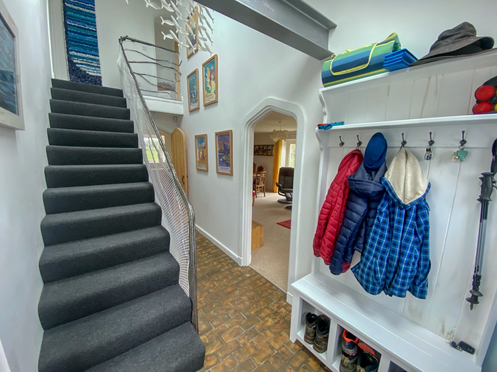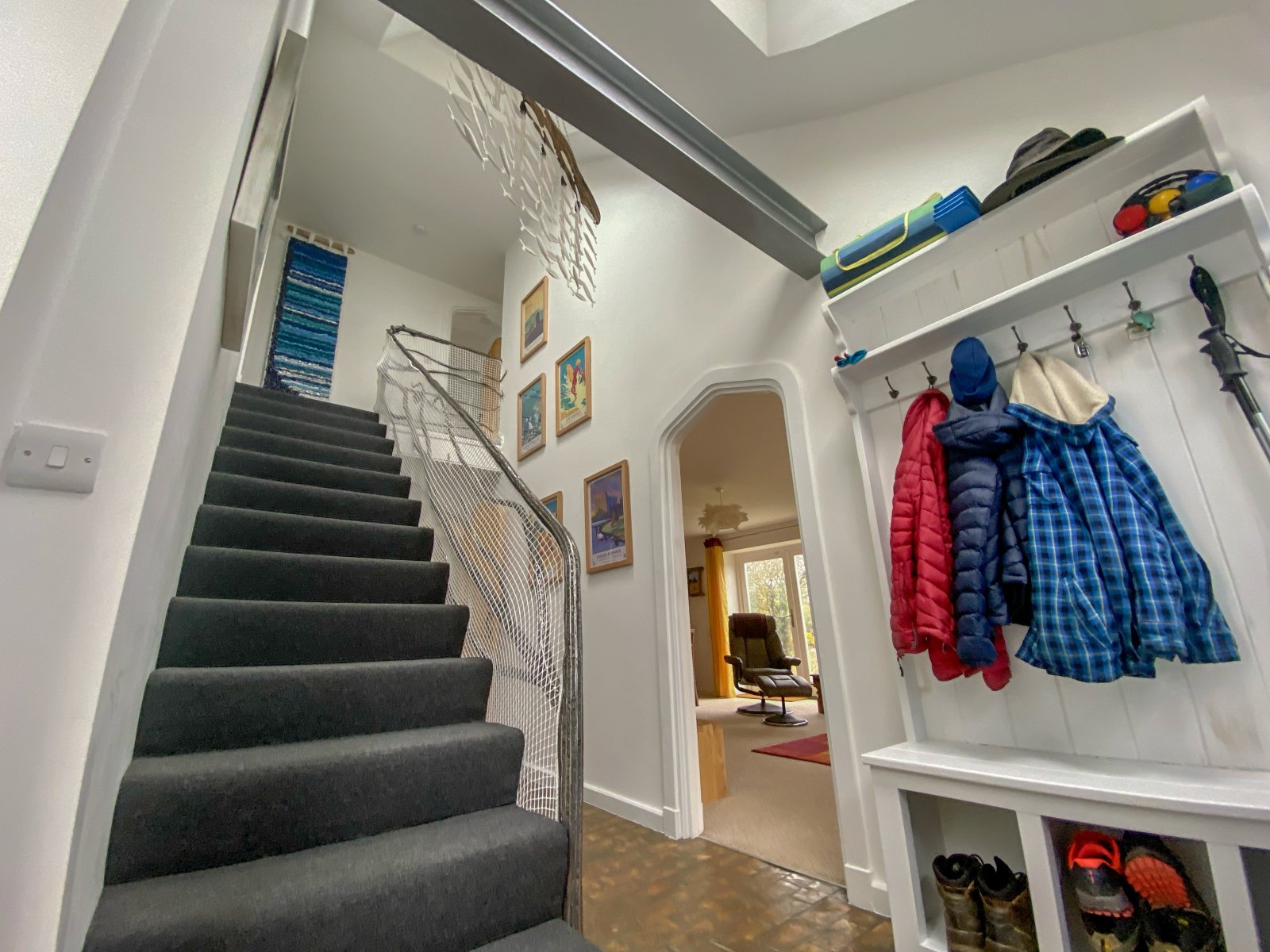 Through double access entrance doors to a bright and airey entrance hallway, benefitting from bespoke wood tile flooring, exposed RCJ beam, 2 x triple-glazed Velux skiylights above, triple-glazed window, lighting, electric heater, stairway with bespoke steel ballustrading and access to;