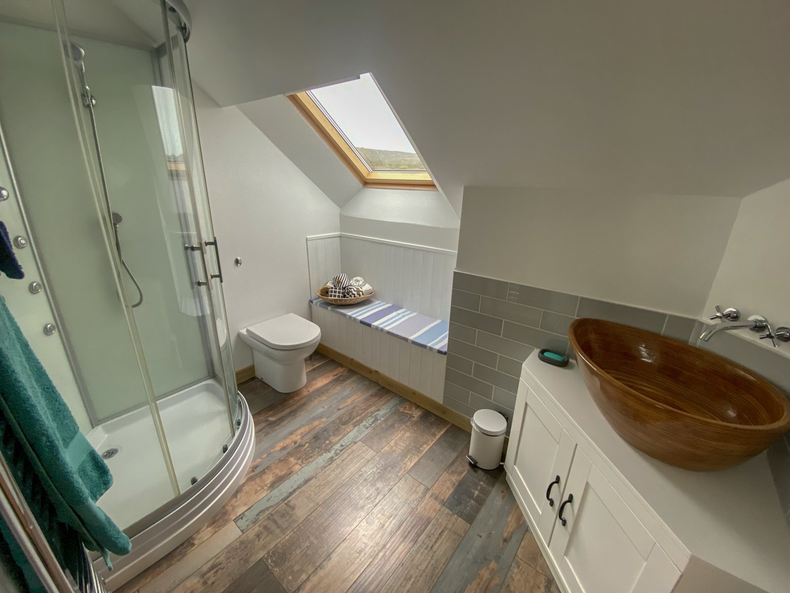 Family bathroom comprising of laminte flooring, Velux skylight, shower with side jets, bay window with seating, vanity unit with bespoke wash basin set within, WC, heated towel railing, LED lighting and underfloor heating.