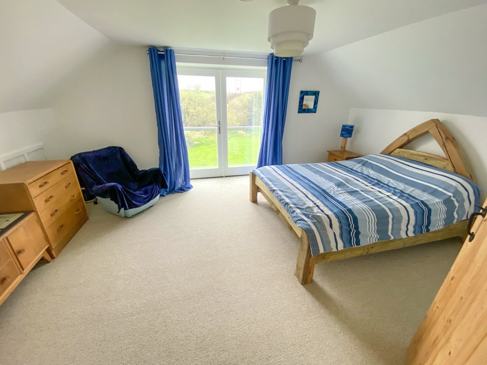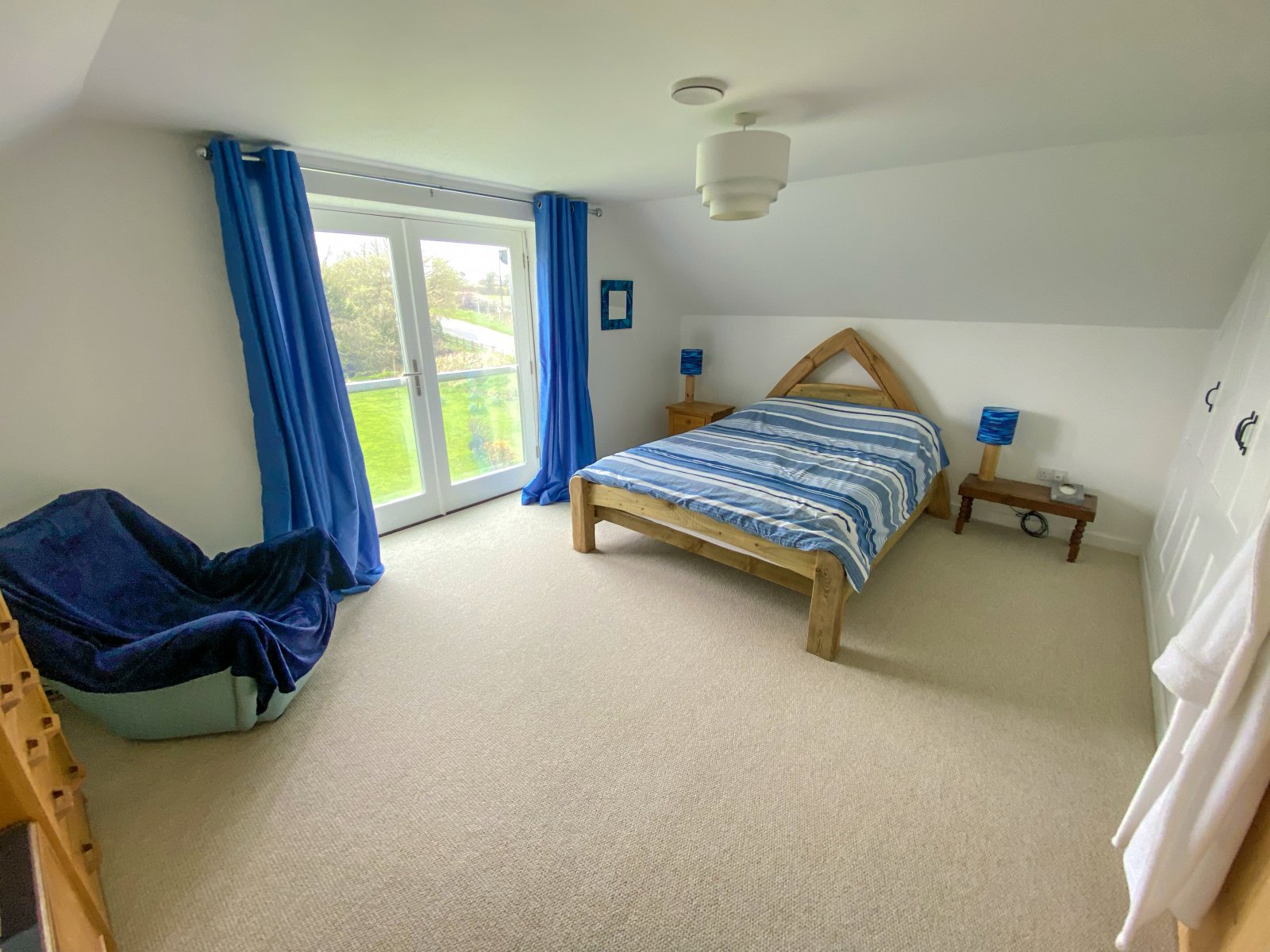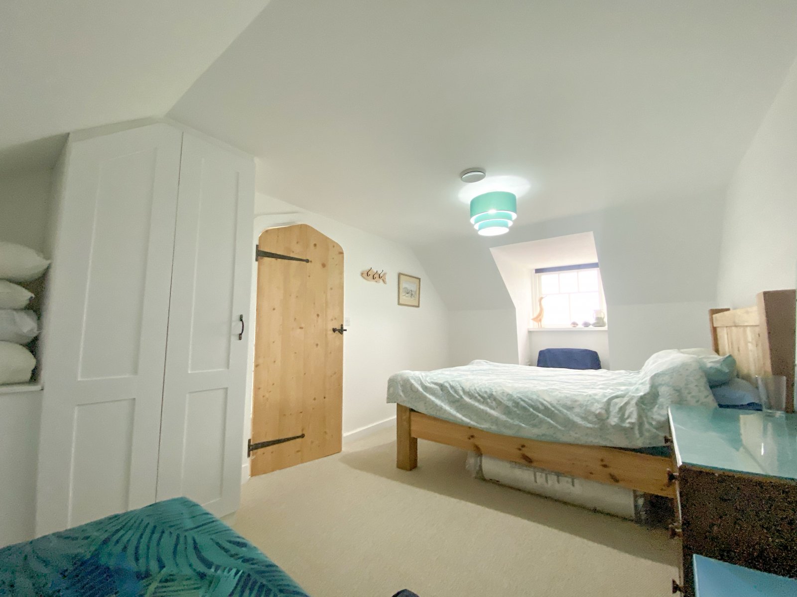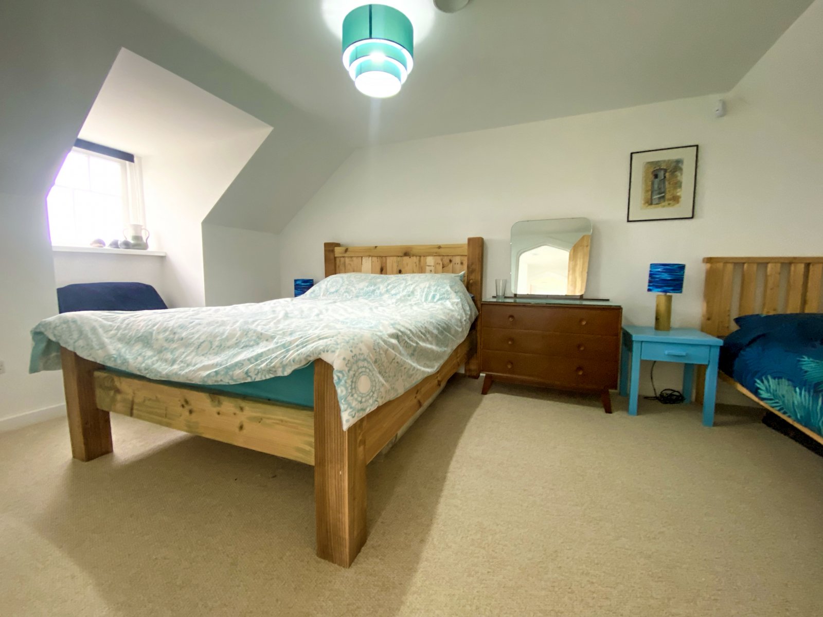 Sizeable double-bedroom space, with exquisite views from the Juliet balcony. Carpeted flooring, pendant lighting, eaves storage, integrated wardrobes.