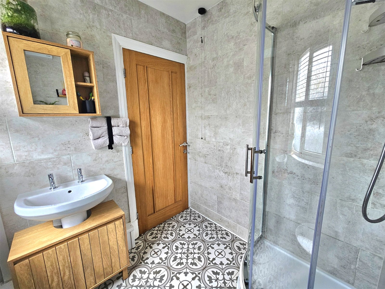 A contemporary and stylish shower room with a walk-in shower cubicle, featuring a glass screen and a rainfall shower head. The walls are finished with large, modern grey tiles, complemented by a decorative patterned tiled floor.