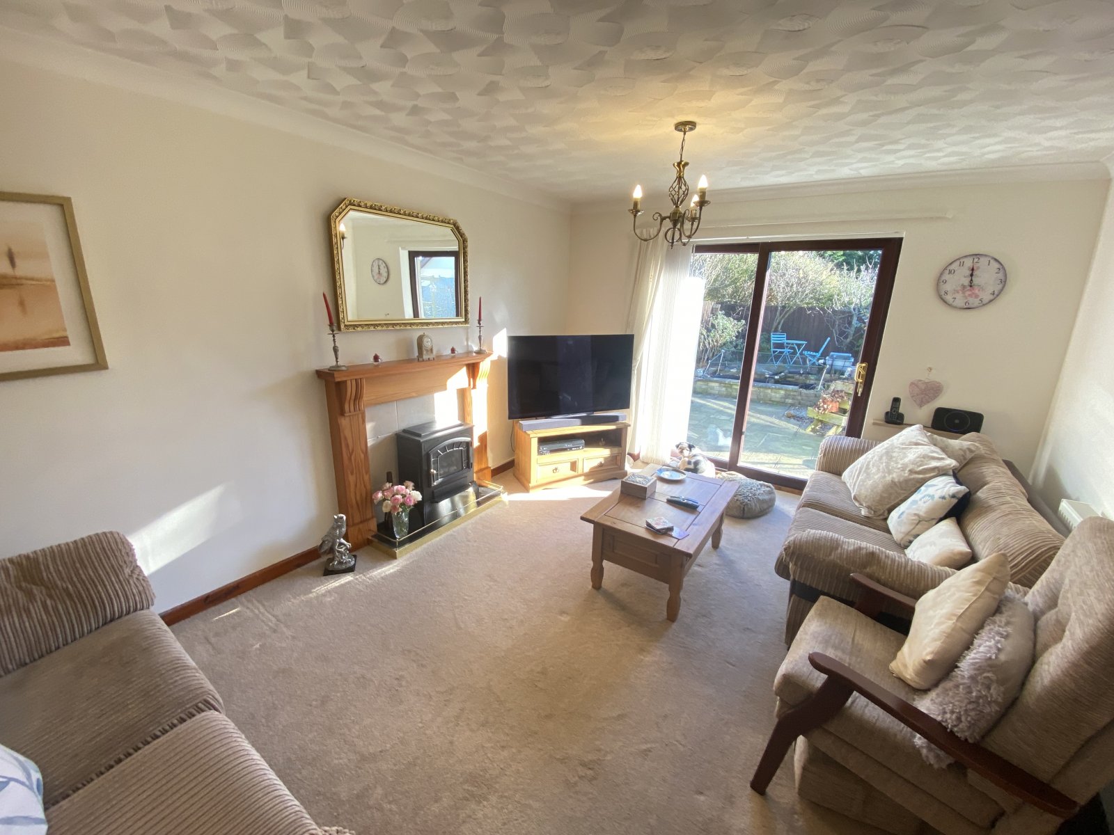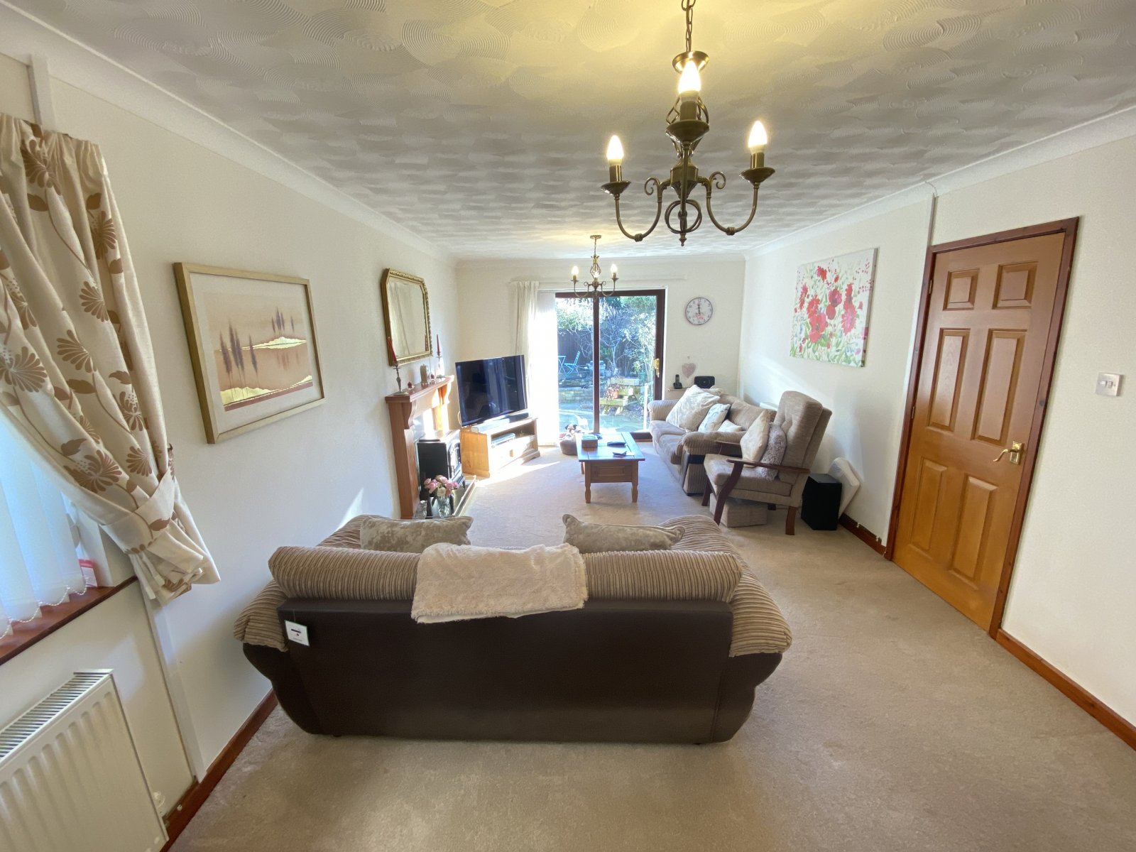 Sizeable lounge, benefitting from carpeted flooring, uPVC double-glazed window to side, sliding doors to patio and rear garden, electric fire with mantelpiece surround, radiator, power points, t.v. point.