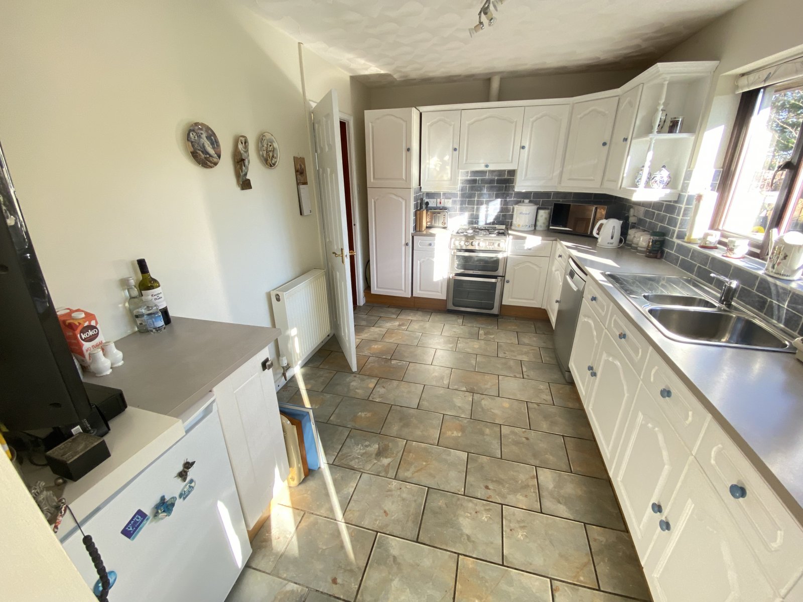 Solid wood base and wall units with matching cooker hood, tiled surround, complementary work surfaces, inset gas cooker with four ring hob, electric oven/grill, plumbing for dishwasher, inset 1.5 stainless steel bowl sink and drainer with mixer taps, radiator, power points, uPVC double-glazed window to rear and access to;