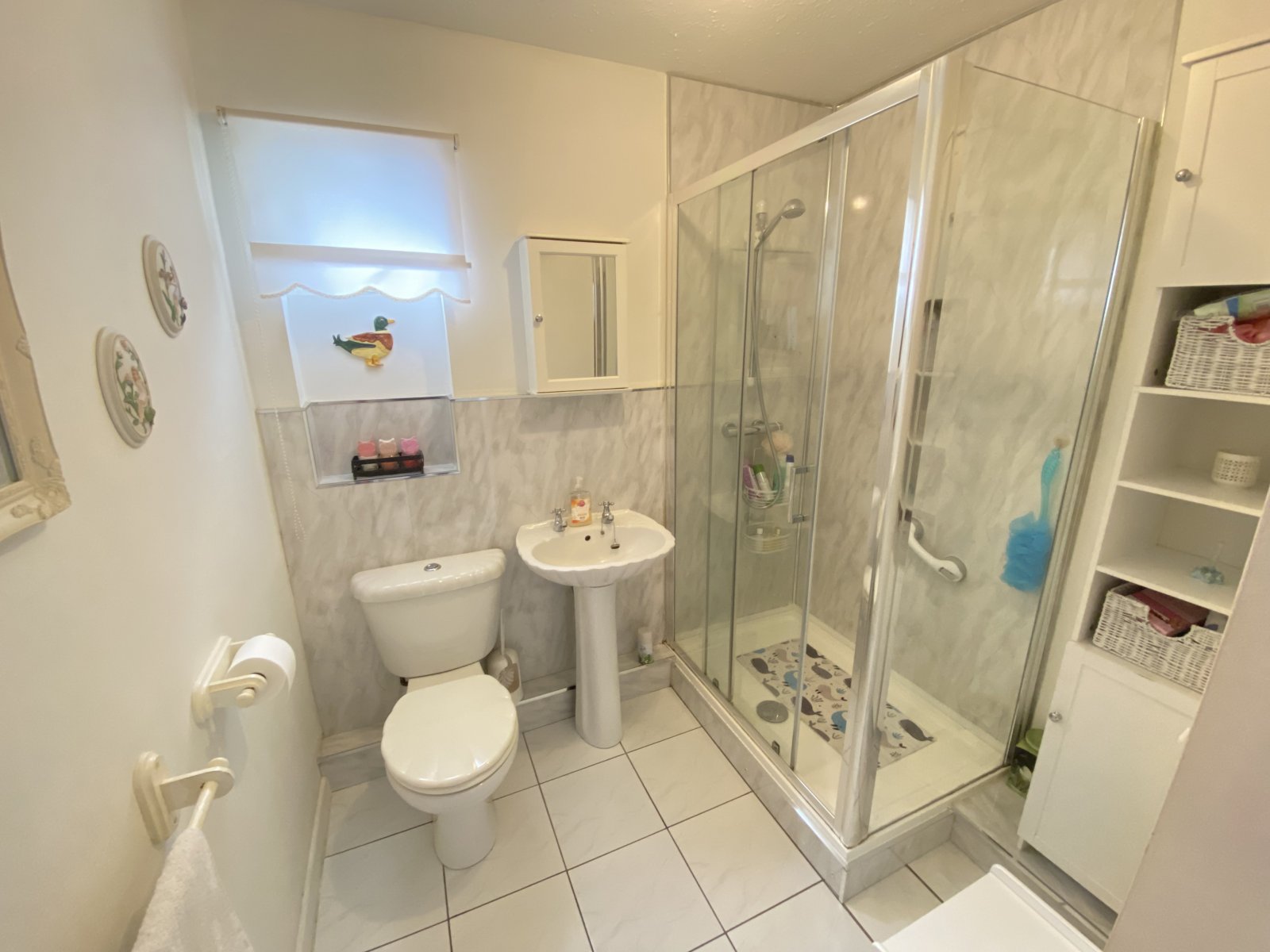 Immaculate shower room suite with pedestal wash hand basin and w.c., shower with glass panel surround, part tiled, radiator, extractor fan, obscure glazed window to side.