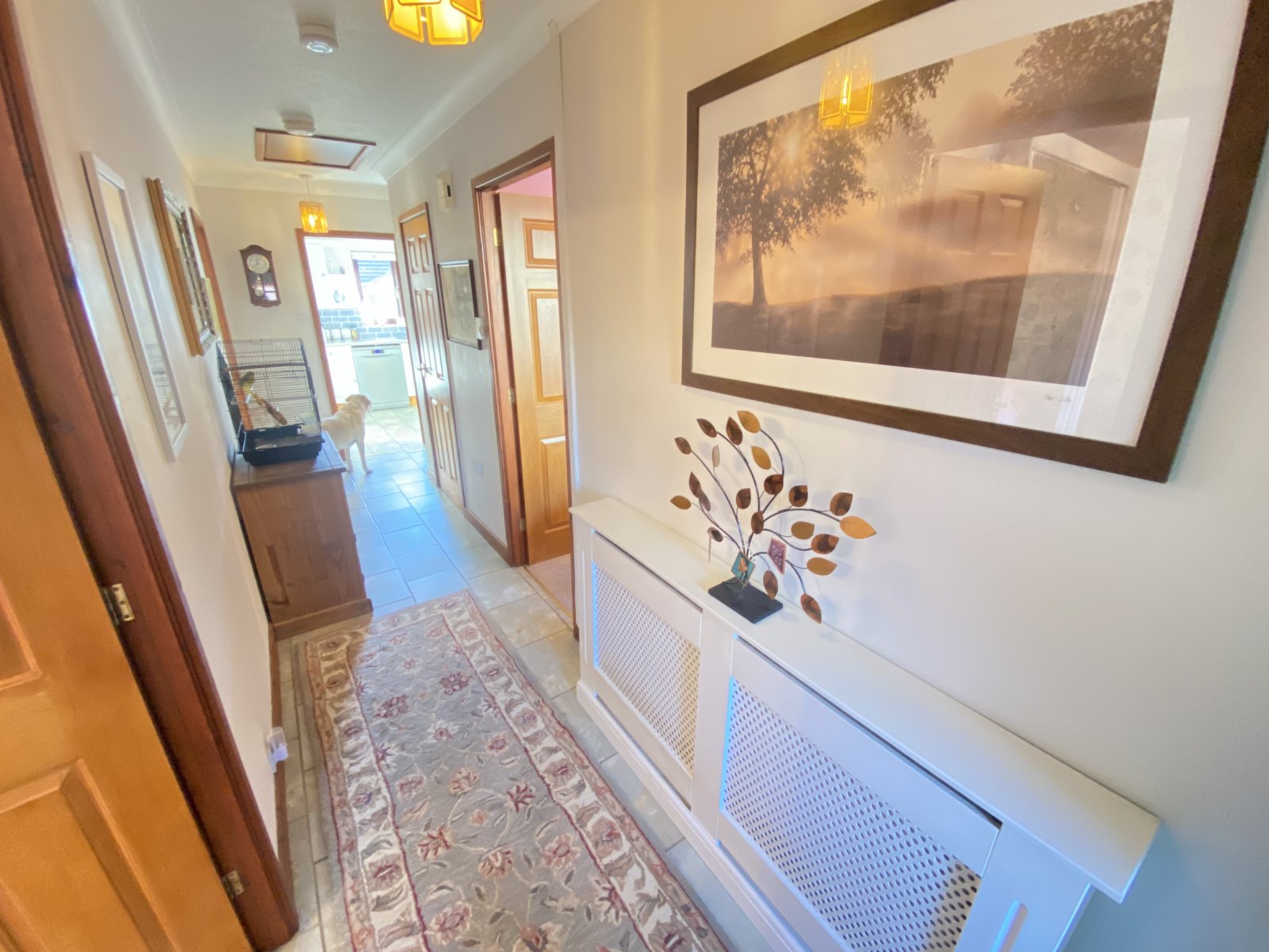 L-shaped, tiled flooring, radiator, power points, door to airing cupboard with radiator, to living room, kitchen, shower room and both bedrooms. Access to spacious loft.