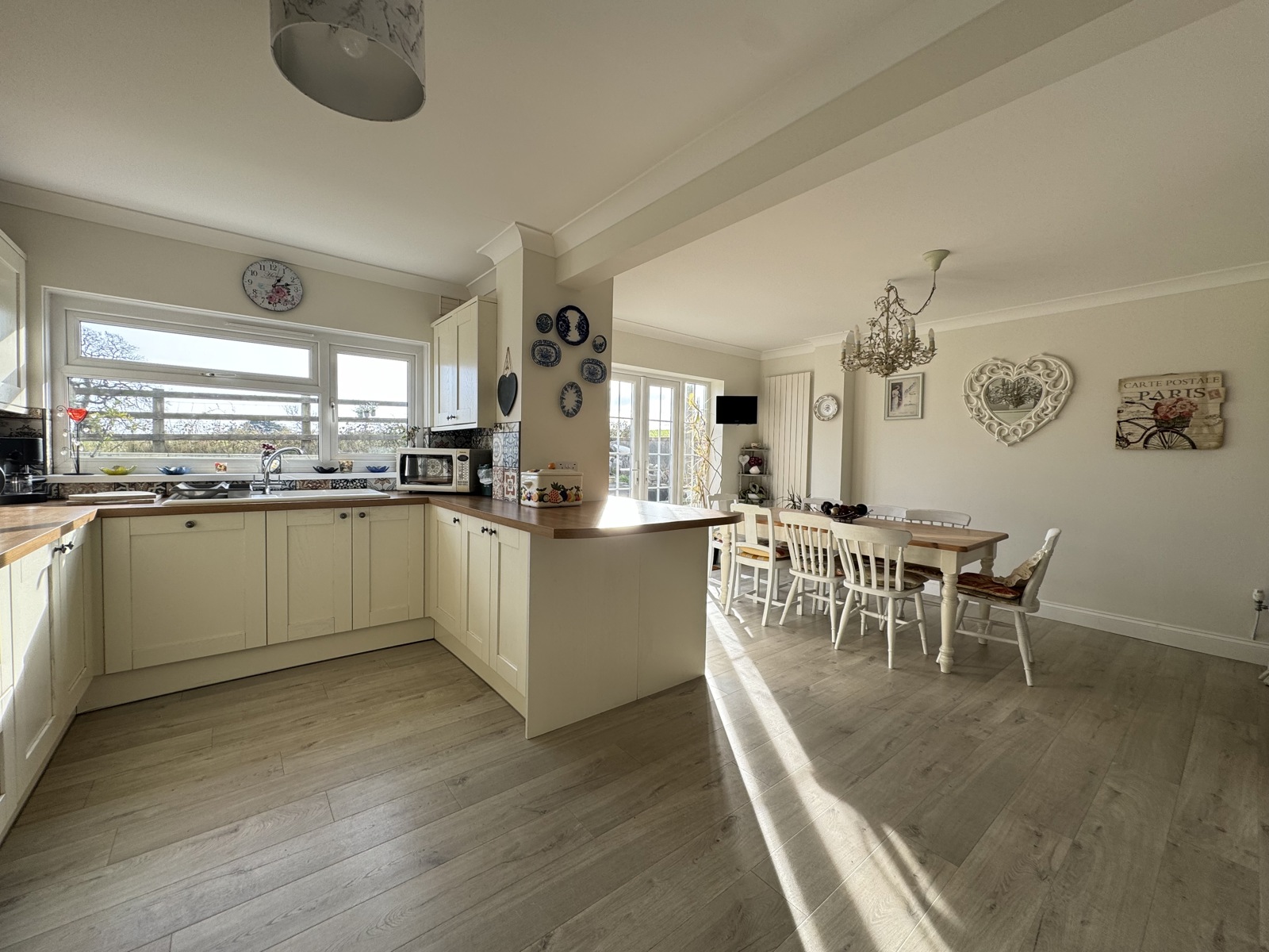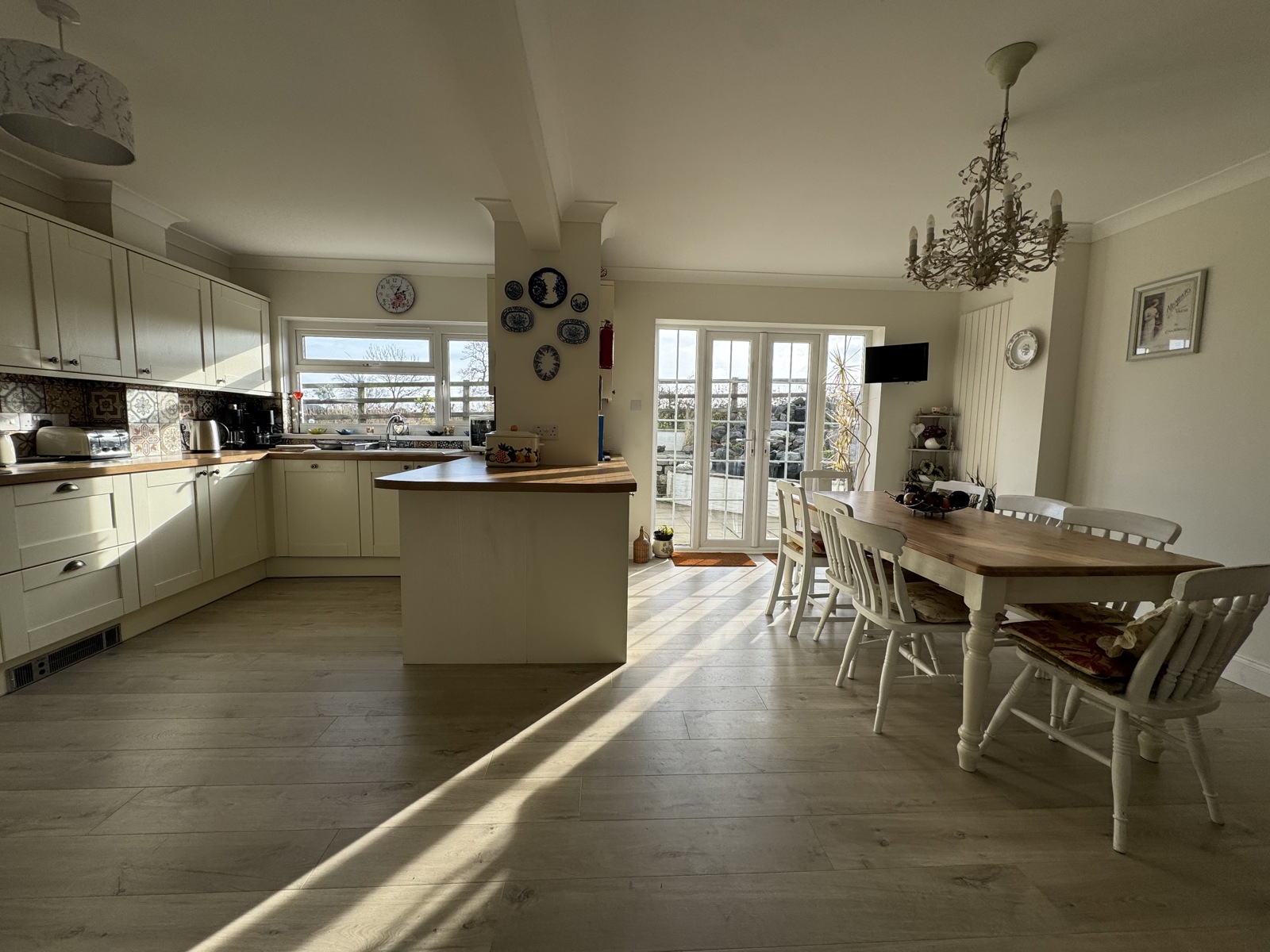 LVT flooring, range of base and eye level units, integrated oven, hob, dishwasher and fridge freezer, sink and drainer, tile splashback, 2x radiator, double glazed uPVC window and patio doors.