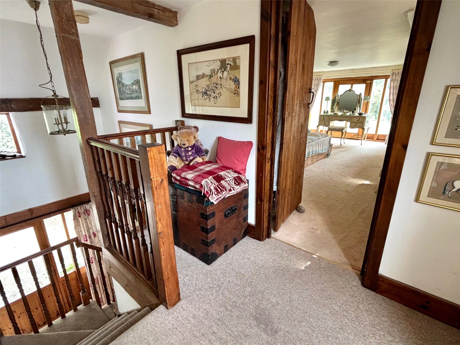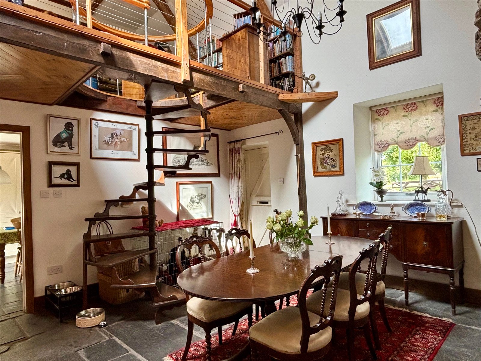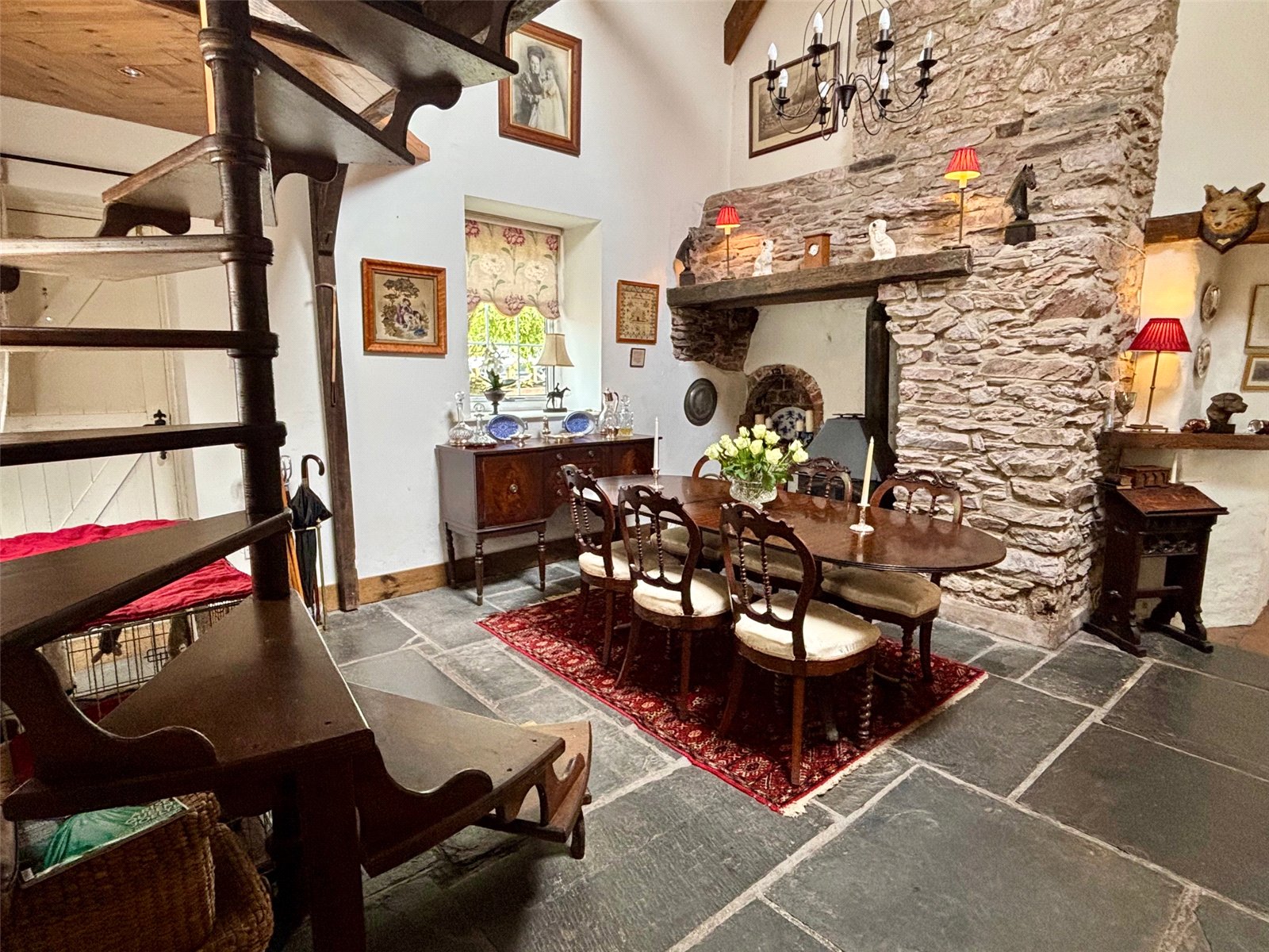 Inside, the home exudes period charm, most notably in the main reception room, which features a stunning inglenook fireplace and soaring vaulted ceilings—perfectly capturing the essence of a traditional country cottage. There are three cosy reception areas in total, including a charming mezzanine level with built-in storage and potential for an en-suite shower room, all overlooking the fireplace and enhancing the home's unique layout.