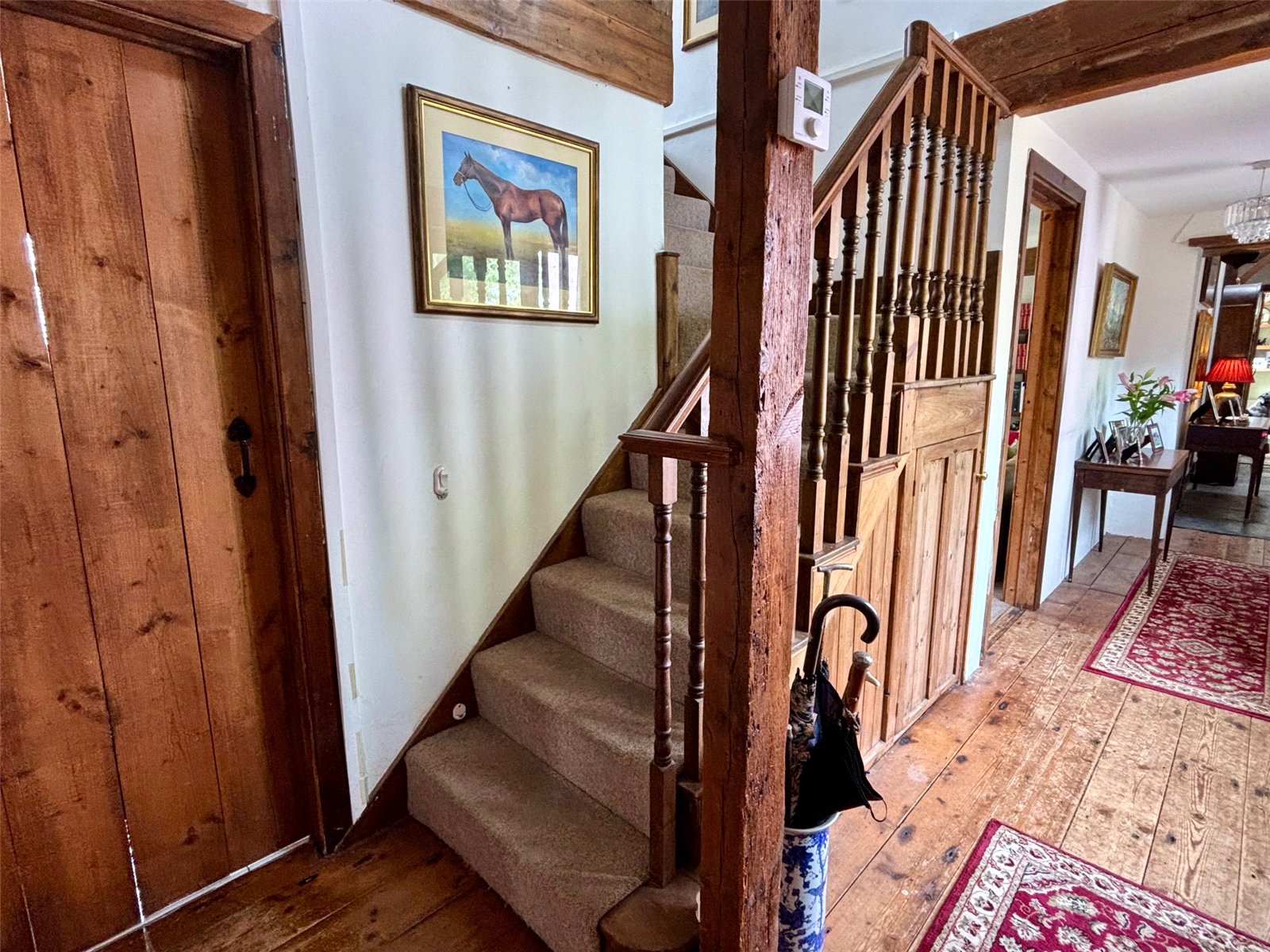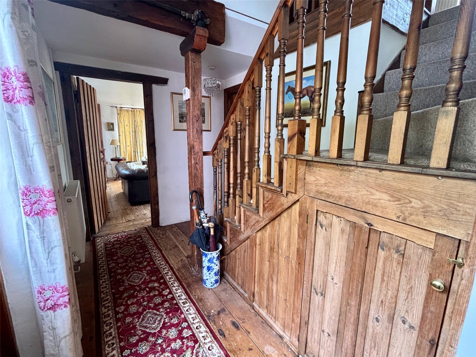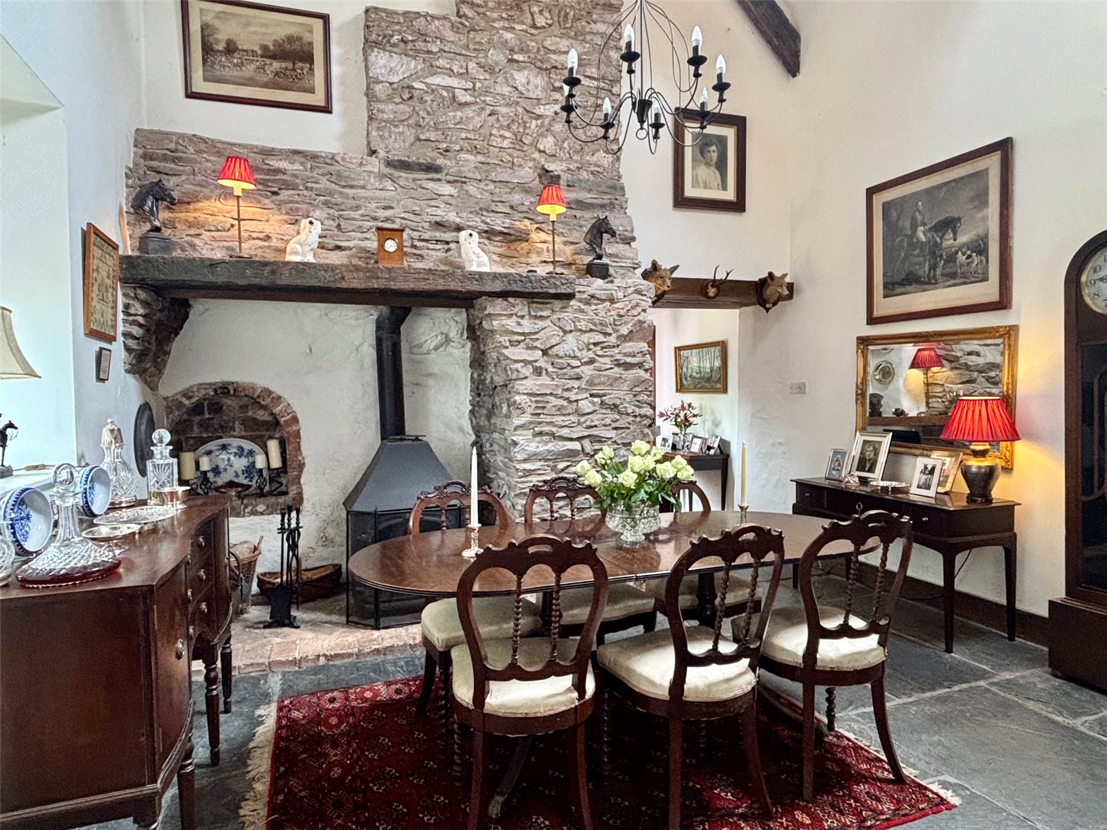 Inside, the home exudes period charm, most notably in the main reception room, which features a stunning inglenook fireplace and soaring vaulted ceilings—perfectly capturing the essence of a traditional country cottage. There are three cosy reception areas in total, including a charming mezzanine level with built-in storage and potential for an en-suite shower room, all overlooking the fireplace and enhancing the home's unique layout.