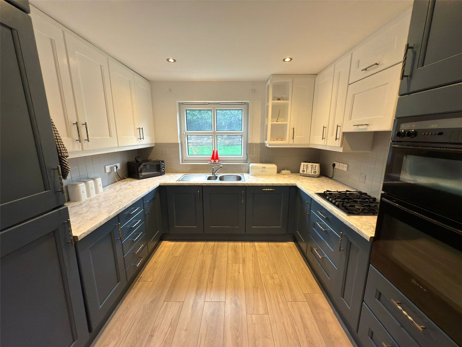 Laminate flooring, fitted kitchen units and a uPVC double glazed window overlooking the rear garden.