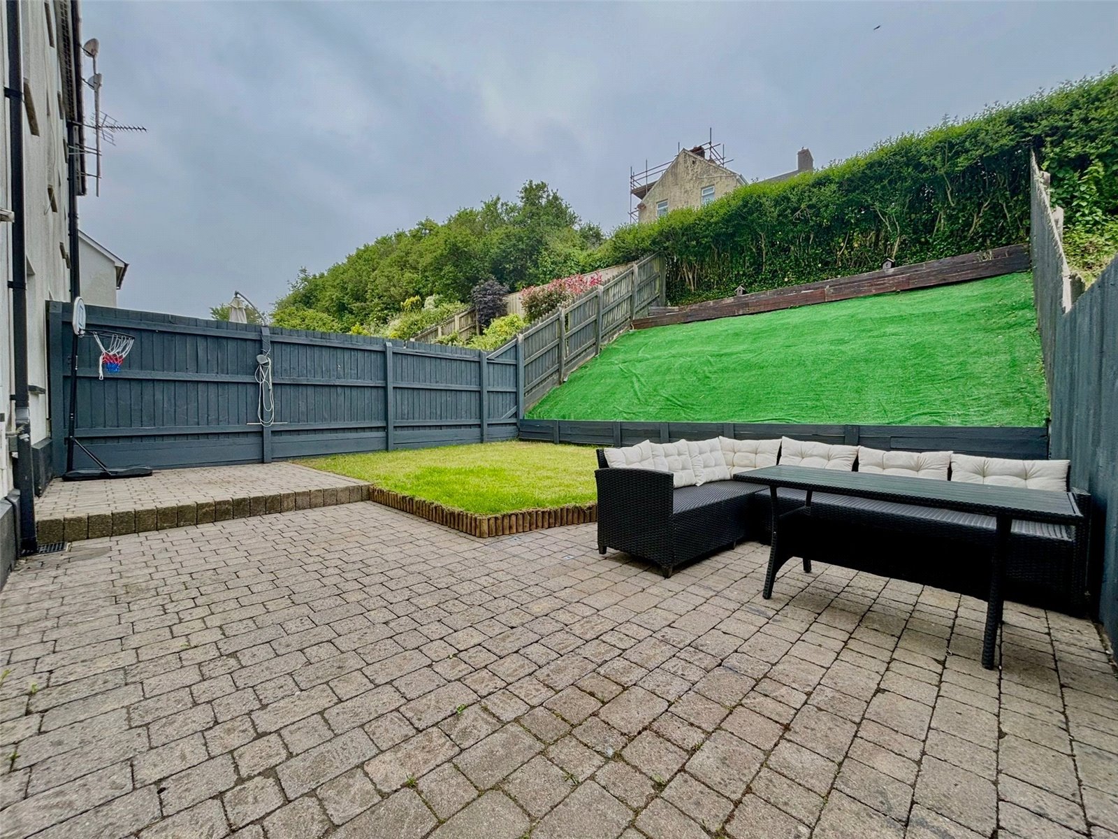 To the fore there is parking for multiple cars and to the rear there is a patio area, lawn space and a slope laid with turf.