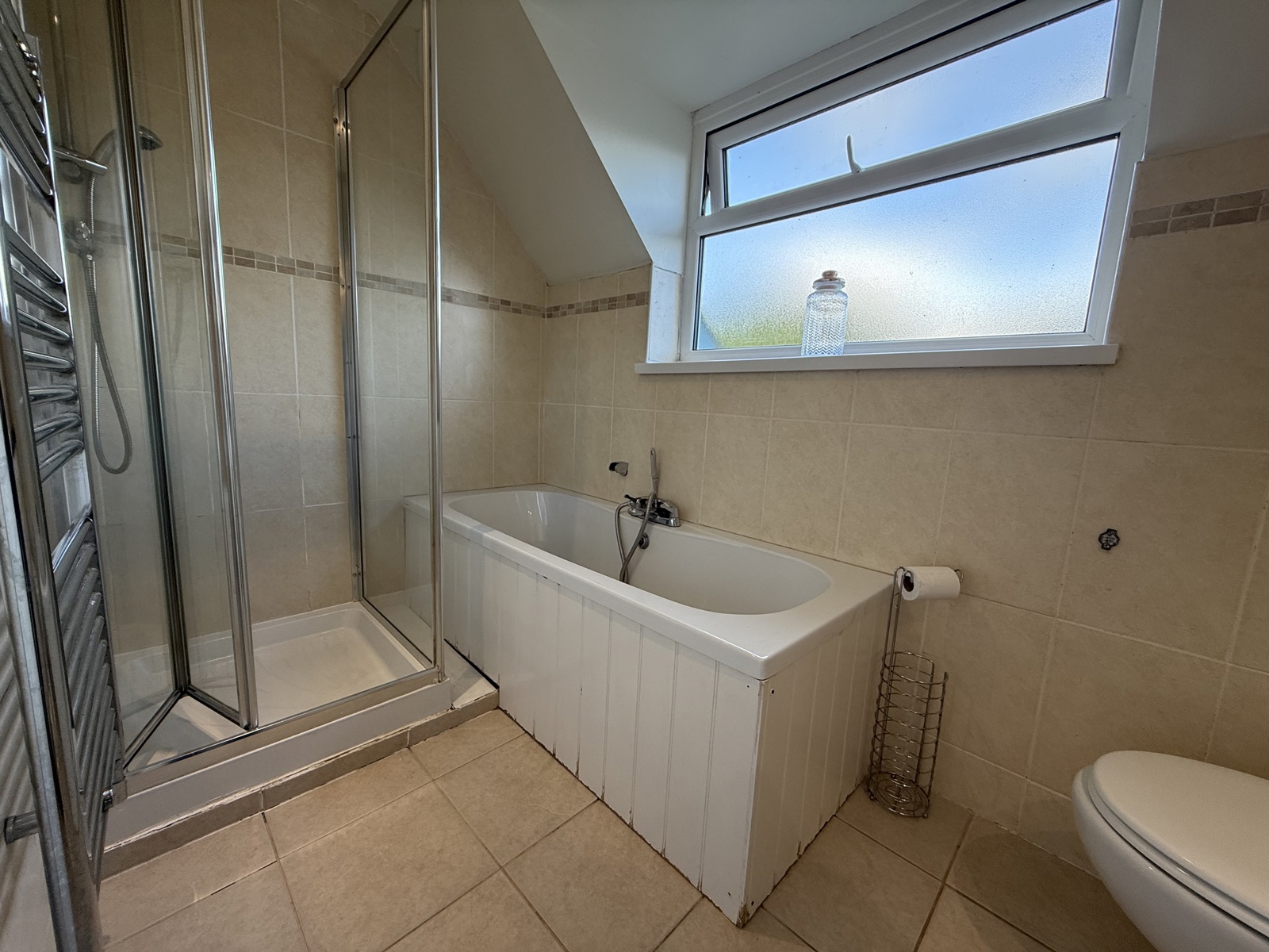 Fully Tiled, Shower with Glass Screen, Bath, WC, Storage Unit With Wash Hand Basin, Towel Rail, Frosted Window