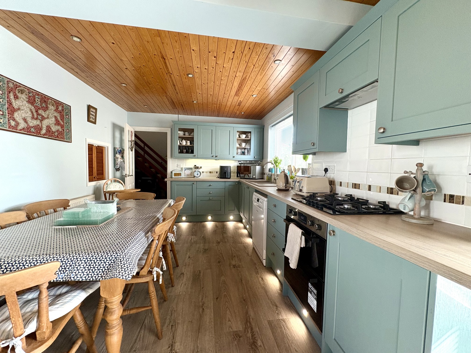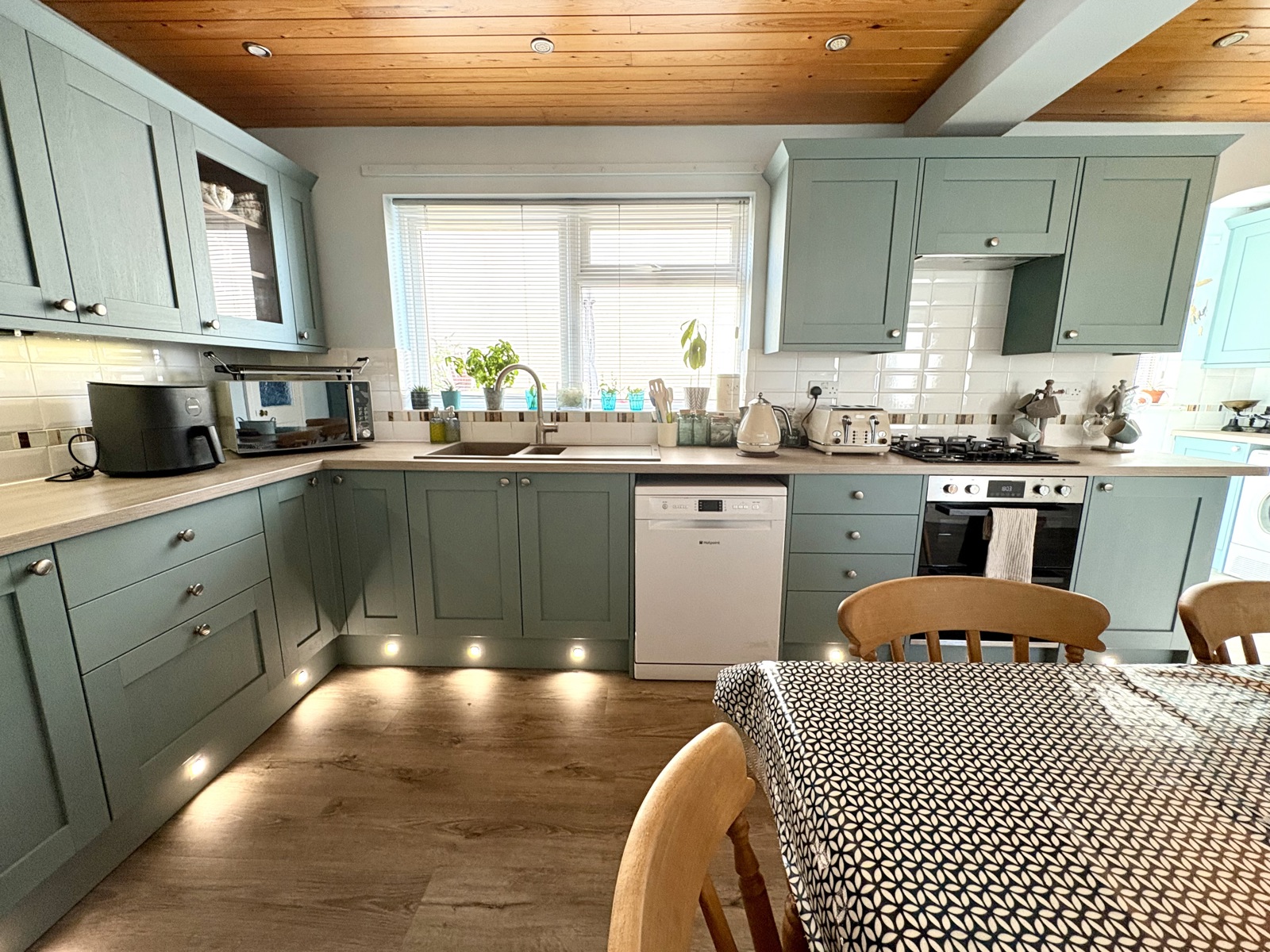 Laminate flooring, range of base and wall mounted units, tile splashback, double oven and hob, space for fridge freezer and dishwasher, radiator, double glazed uPVC window.