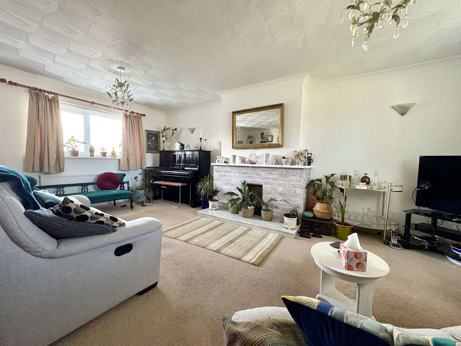 Carpet flooring, fireplace (gas has been capped), 3x radiator, 3x double glazed uPVC windows.