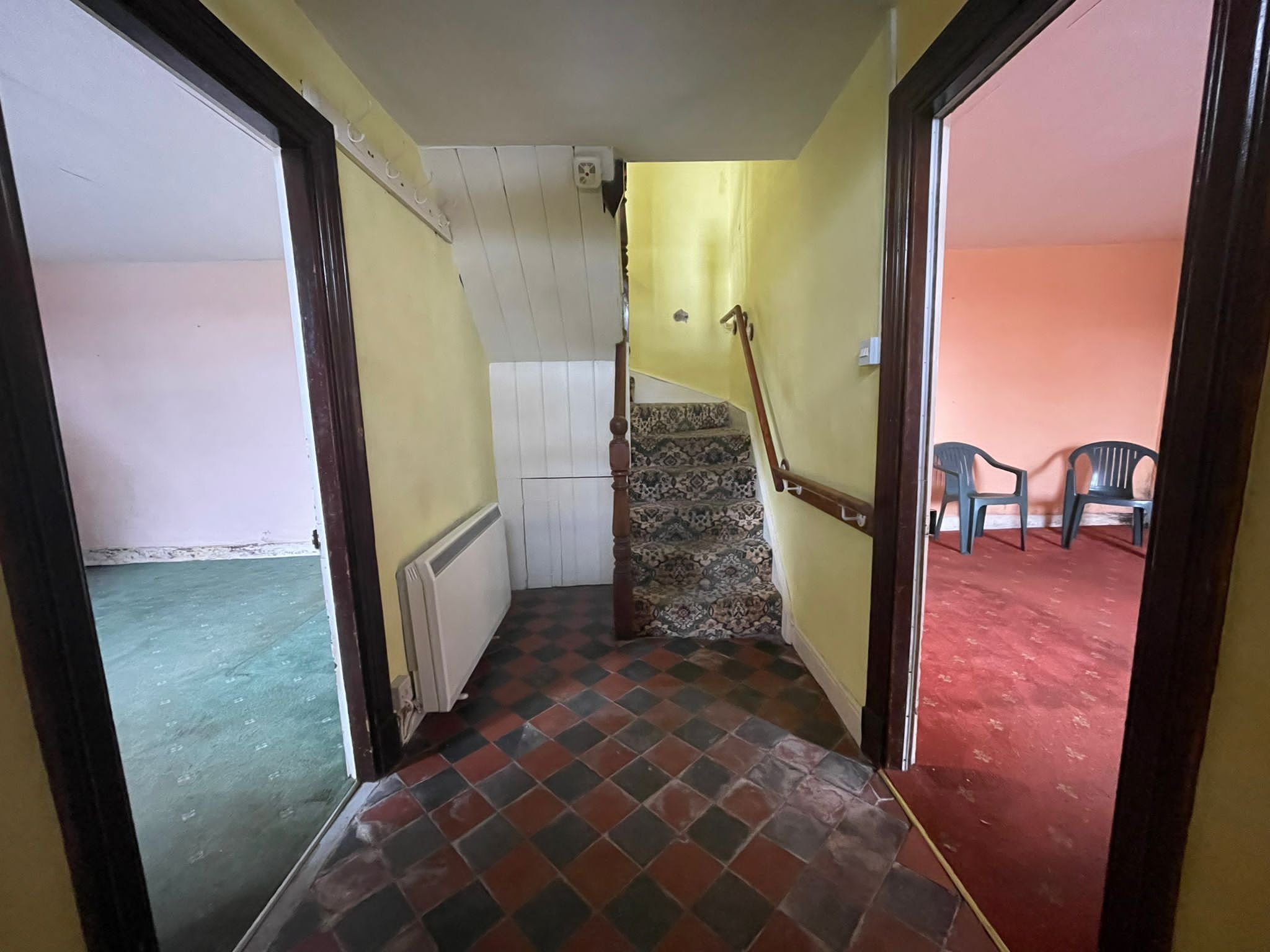 White UPVC front door leads to small entrance hall with tiled floor and under stairs storage cupboard.