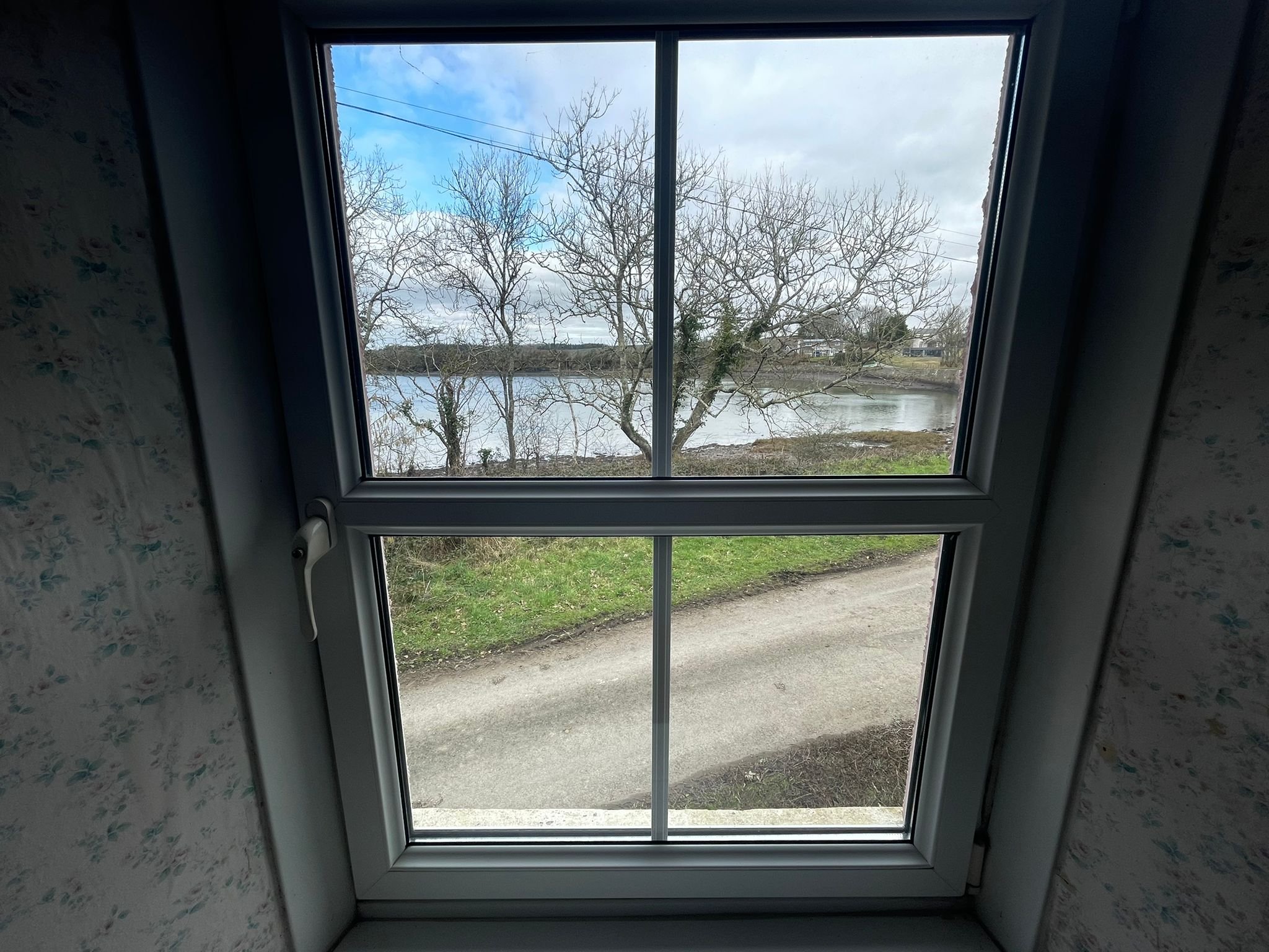 Front aspect with water side view through white UPVC window.