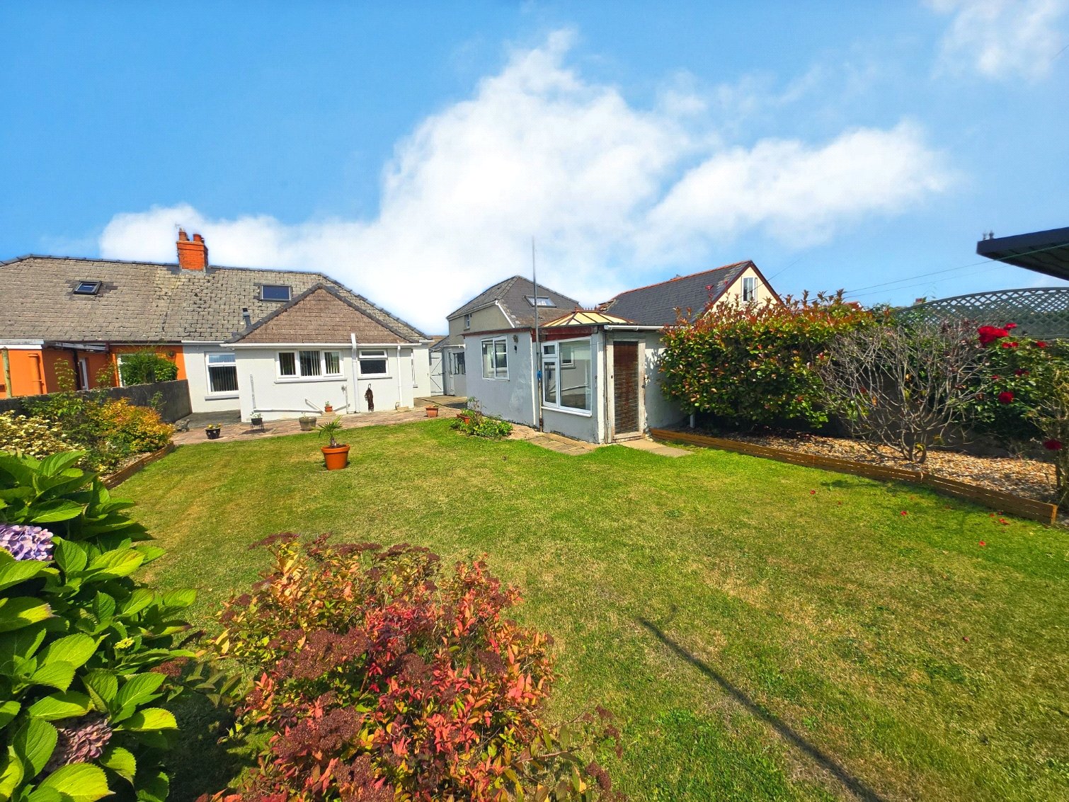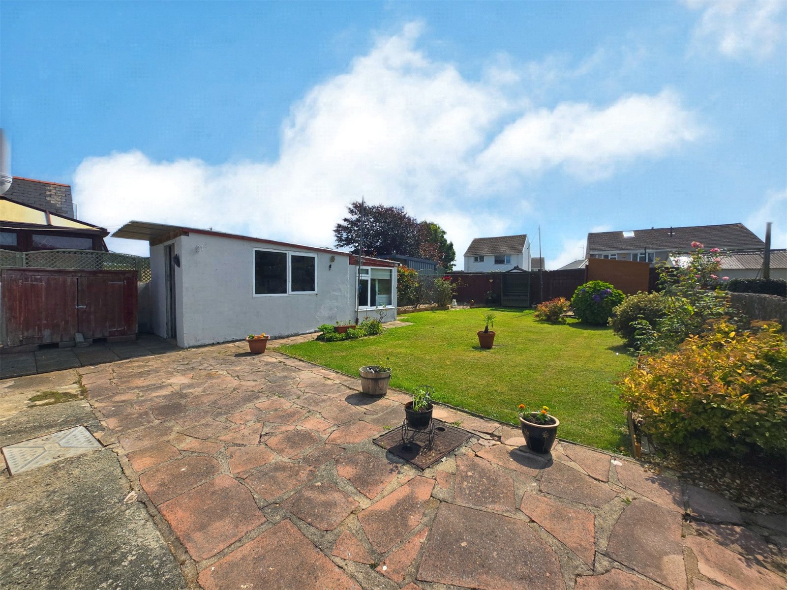 This charming bungalow offers an attractive and well-maintained exterior. The front of the property features a well-manicured lawn with a decorative fountain as a centrepiece, and a paved driveway provides ample off-road parking. The rear of the property boasts a generously sized garden, predominantly laid to lawn, with a variety of mature shrubs and planting beds, creating a private and peaceful outdoor space. There is a patio area, perfect for outdoor dining and entertaining, and a garden shed and multiple outbuildings for additional storage. The property's exterior is a lovely blend of practical features and aesthetic appeal, perfect for those who enjoy outdoor living.