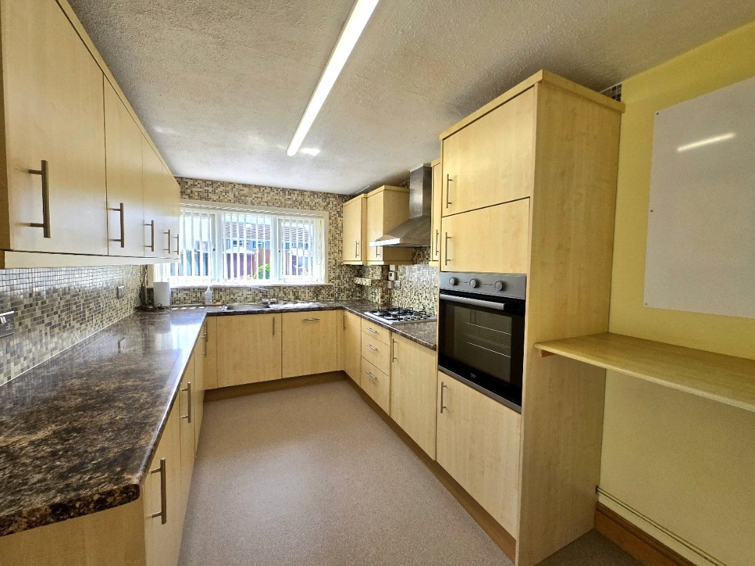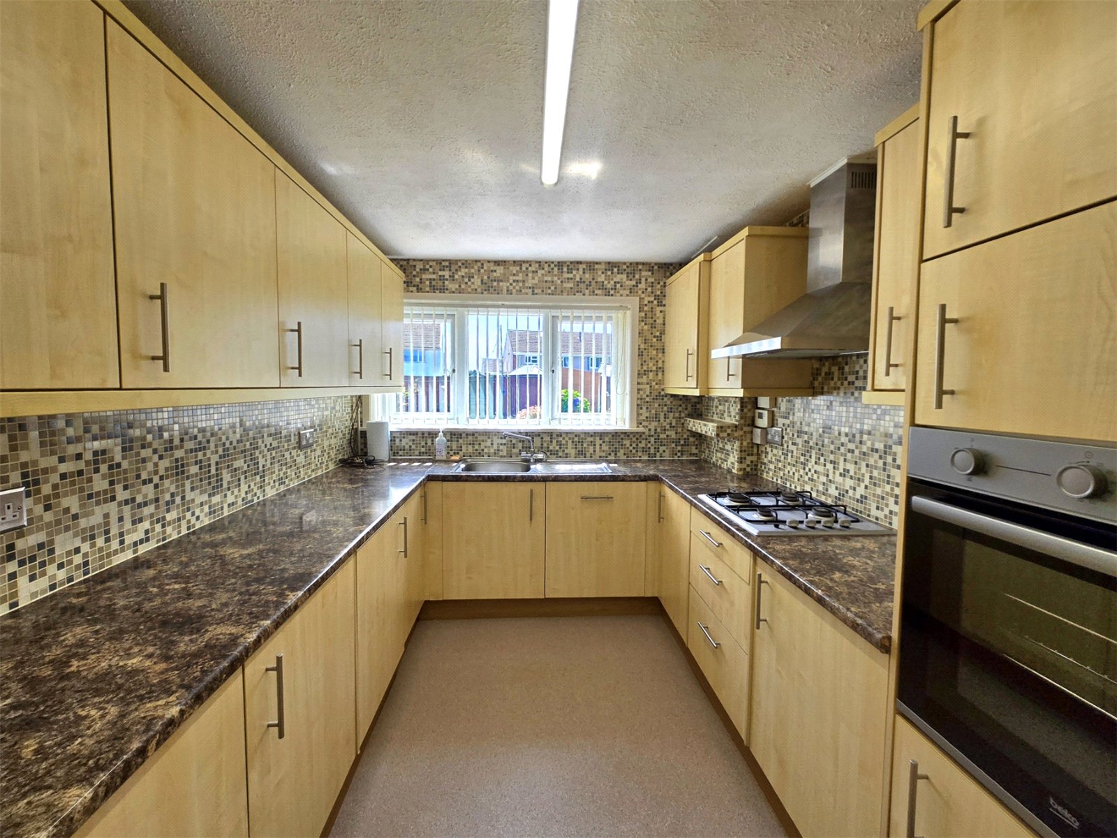 This spacious and functional kitchen is designed for practicality and style. It features a range of light wood-effect wall and base units, providing ample storage, complemented by sleek, modern T-bar handles. The dark, marble-effect laminate worktops offer a striking contrast and are easy to maintain. A stylish mosaic tiled splashback adds a contemporary touch and runs along the entire length of the kitchen. The kitchen is well-equipped with a gas hob, an integrated oven, an overhead extractor fan, an integrated fridge, an integrated freezer, a dishwasher, and a washing machine. There is a built-in stainless-steel sink with a mixer tap positioned below a large window, which allows for plenty of natural light. The room also benefits from additional shelving and a practical space for a breakfast bar or small dining area. The flooring is a neutral, easy-to-clean vinyl, making this a perfect space for everyday living.