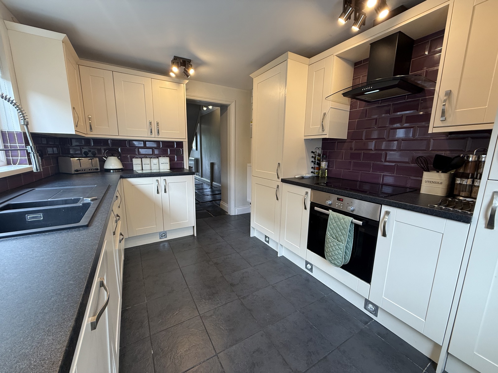 UPVC double glazed window to side, UPVC double glazed door to rear, radiator, floor & wall units, integrated fridge/freezer, integrated dishwasher, electric hob, extractor fan above hob, sink with drainer & mixer tap