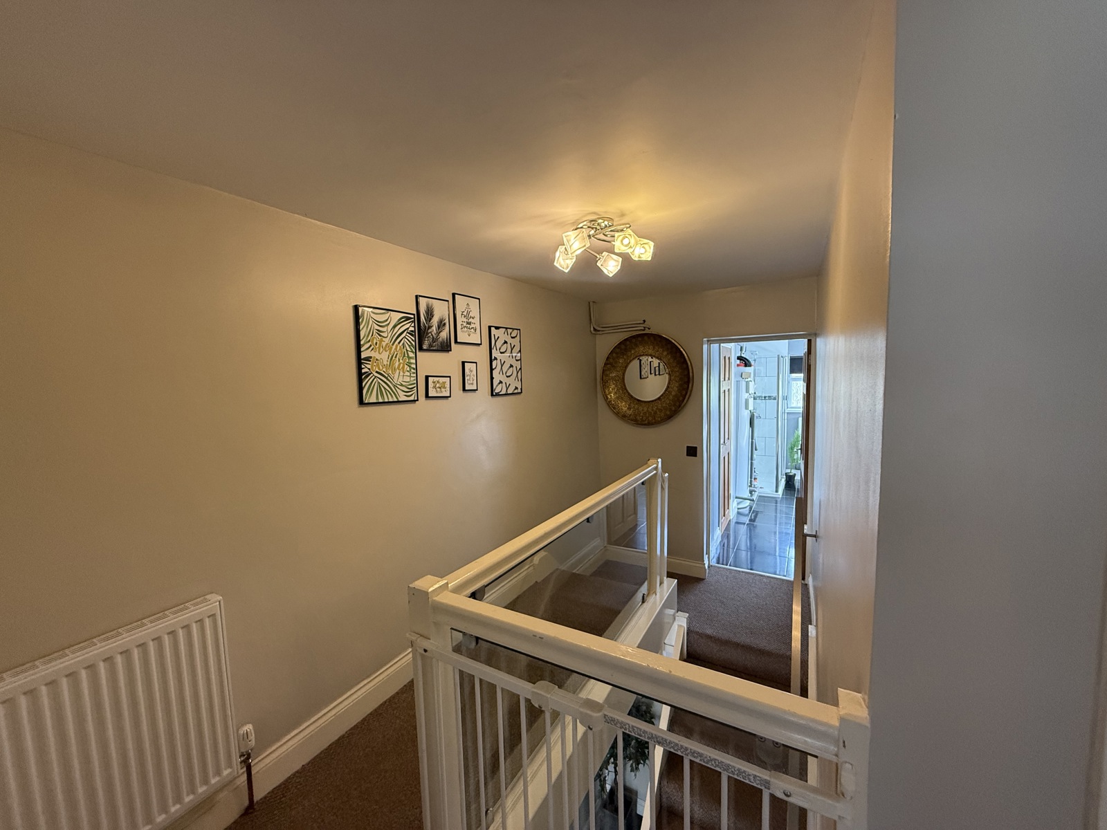 Doors to bedrooms, door to family bathroom, storage cupboard, radiator, glass balustrade