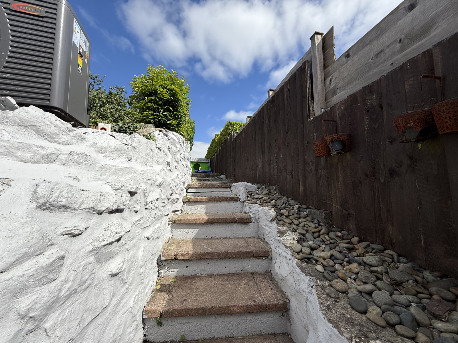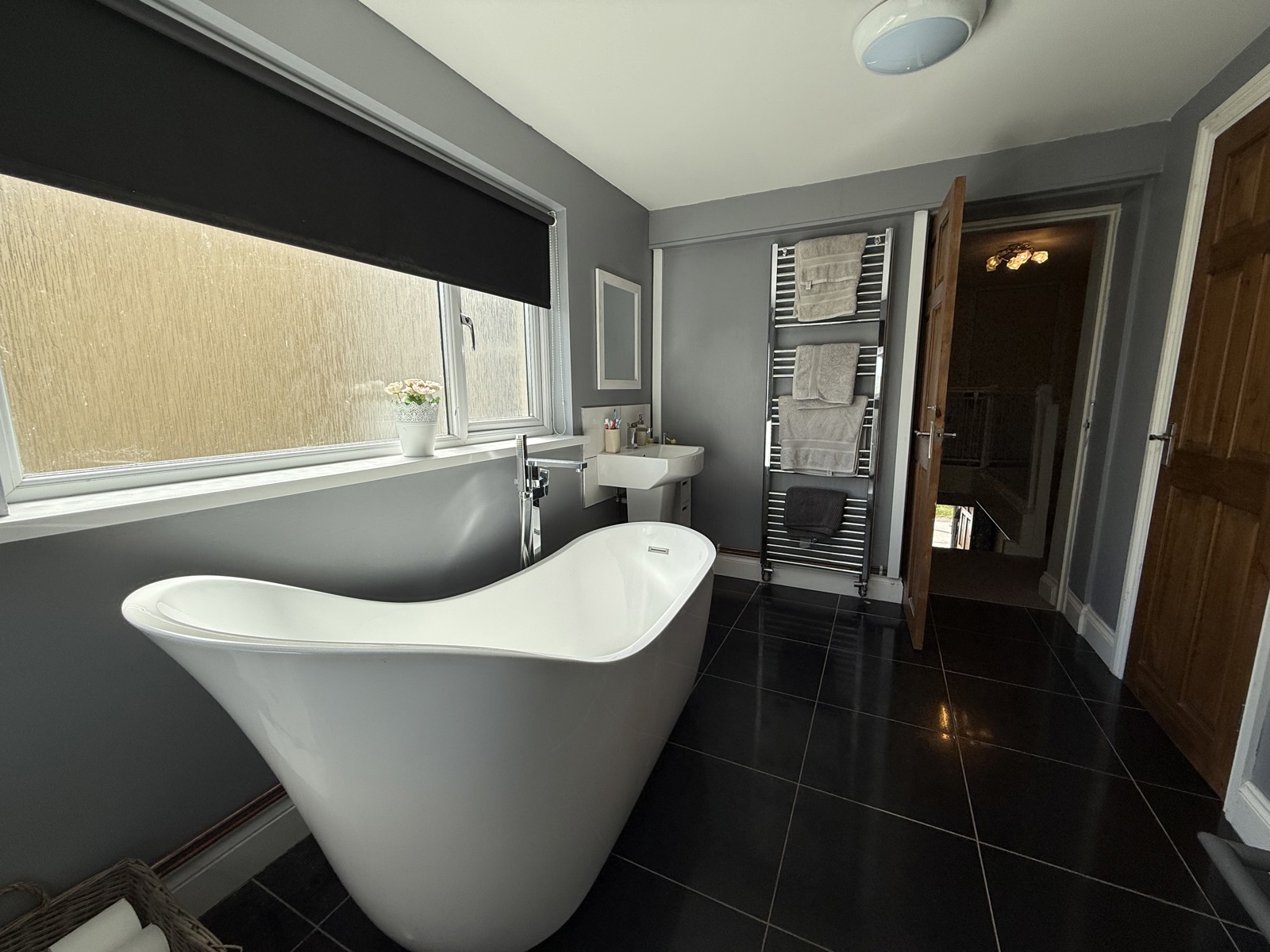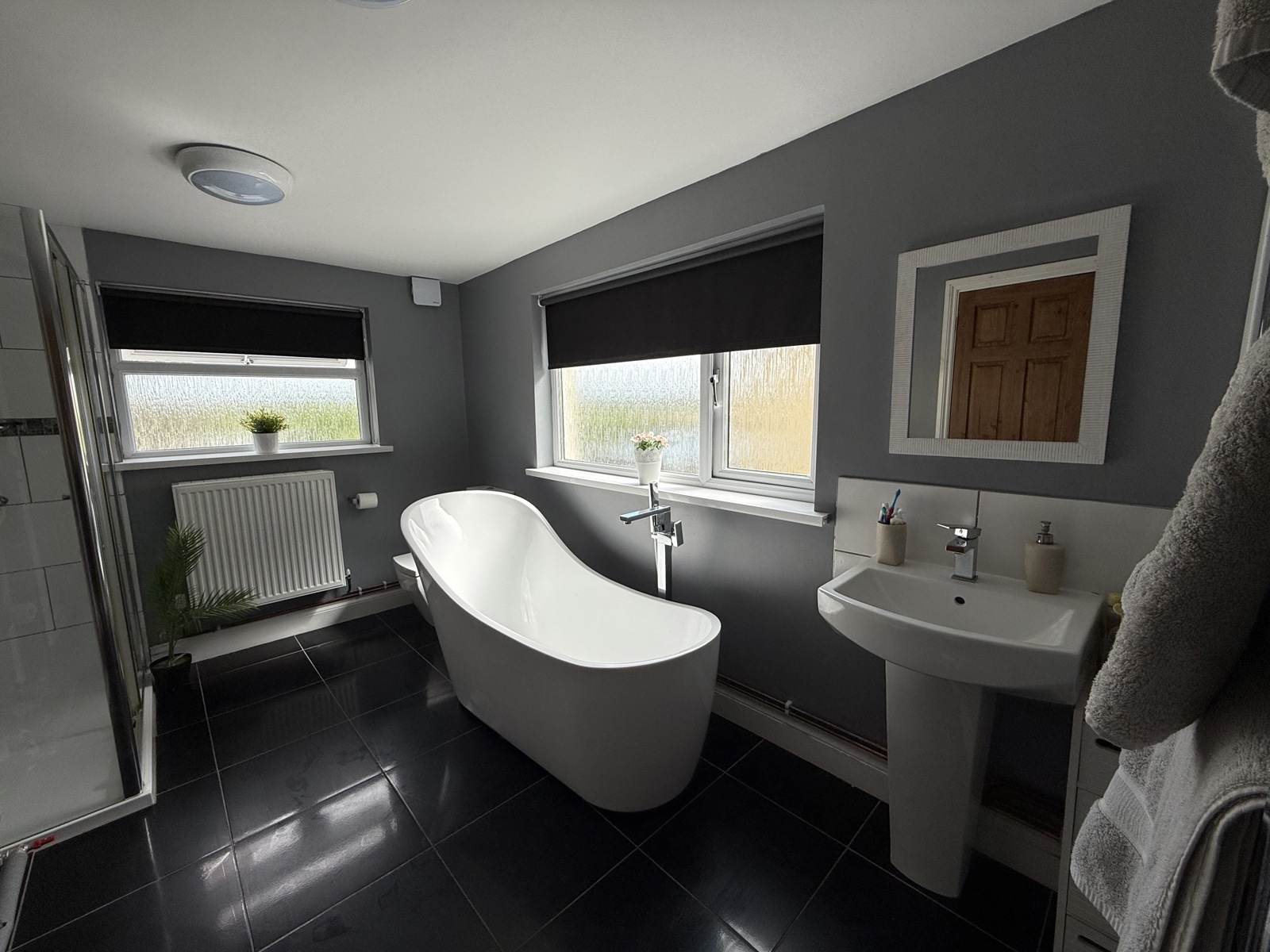 UPVC double glazed frosted galss windows to side and rear, heated towel rail, double shower unit, standalone bath with mixer tap and shower attachment, storage cupboard, hot water tank