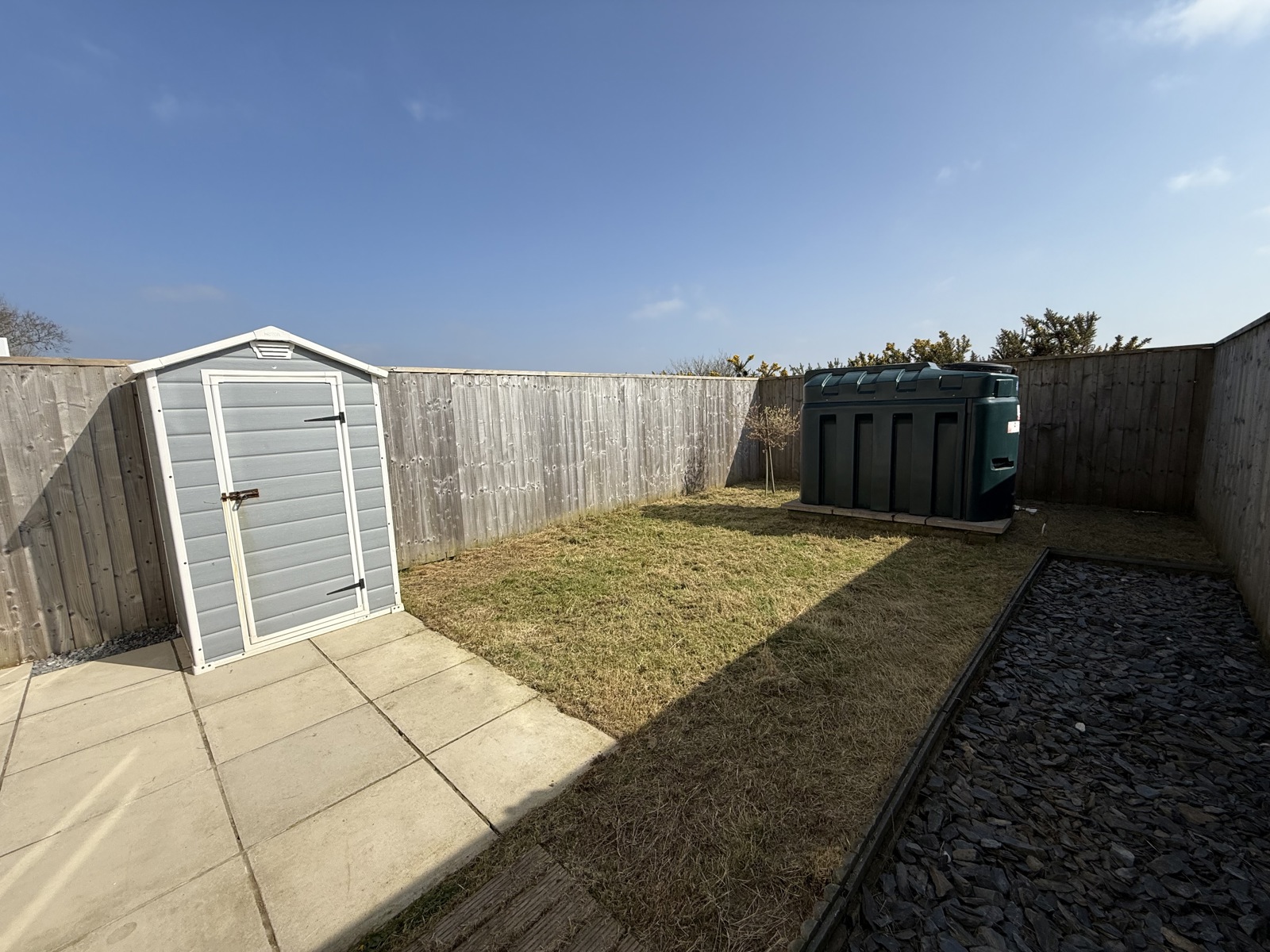 Rear garden laid to lawn and patio, oil tank at the bottom of the garden and oil boiler in the corner.