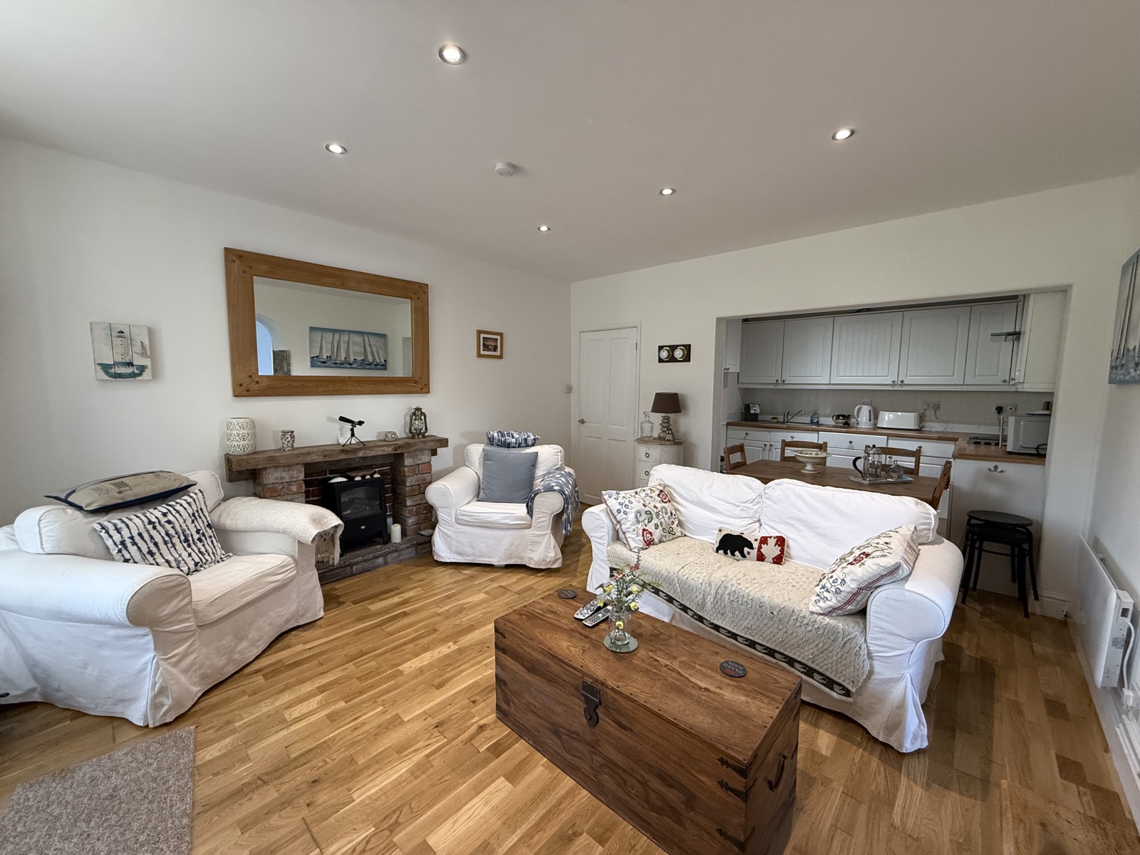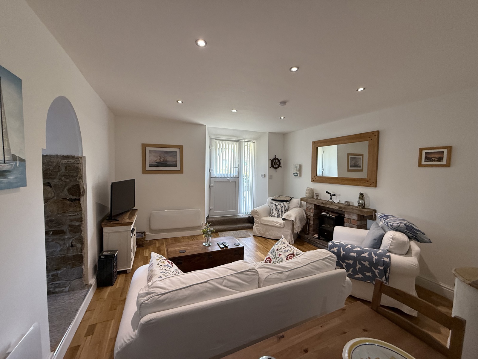 uPVC stable door, laminate flooring, uPVC double glazed window to the front, radiator, fireplace, down lighting.