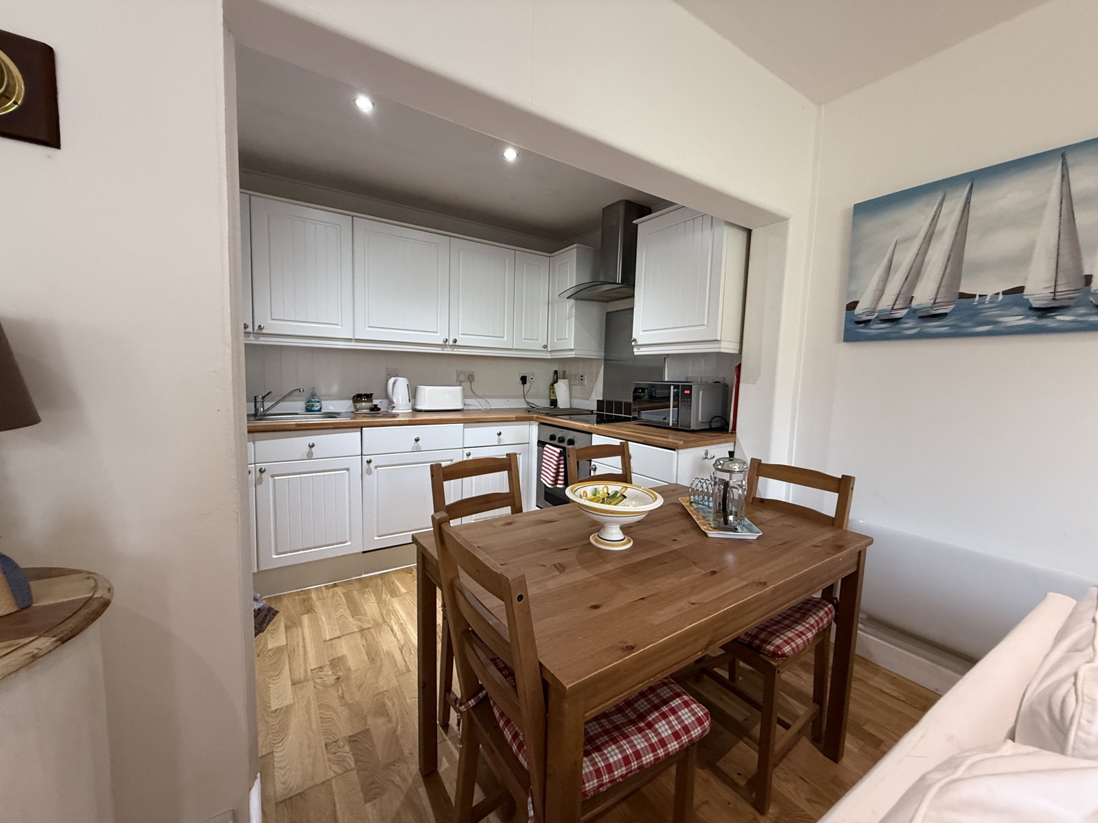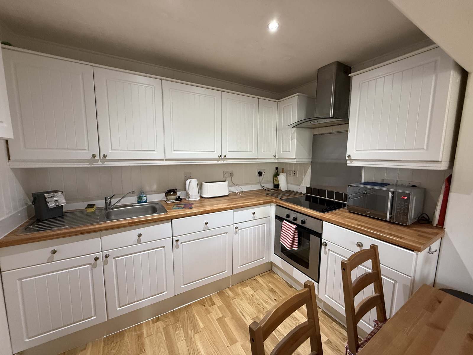 Laminate flooring, selection of base and wall units, electric oven & hob, stainless steel splashback, extractor fan and down lighting.