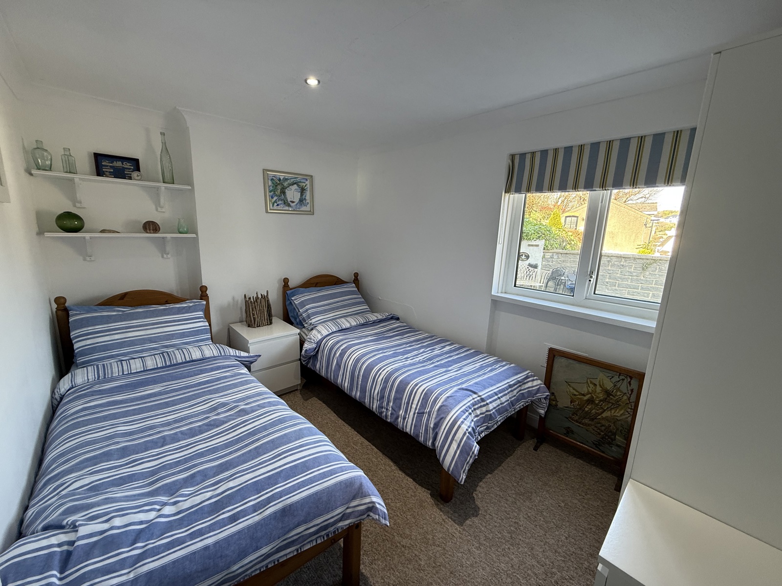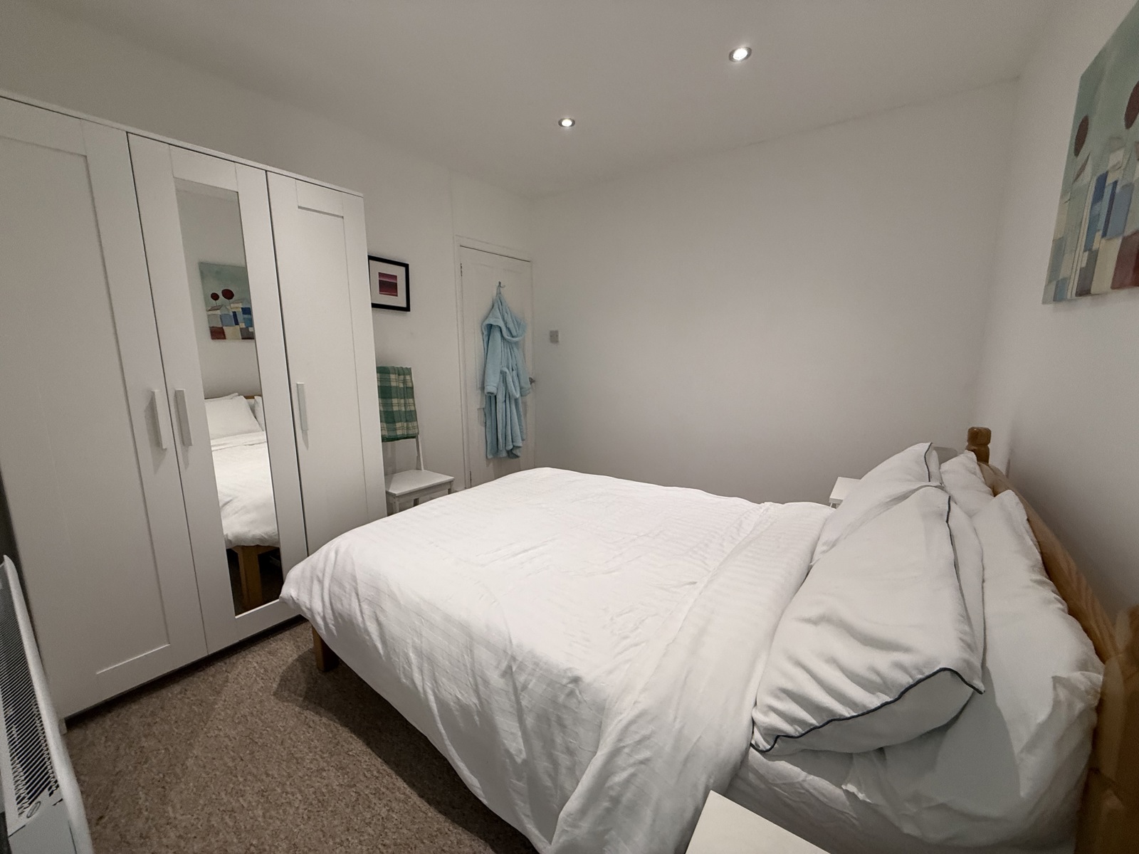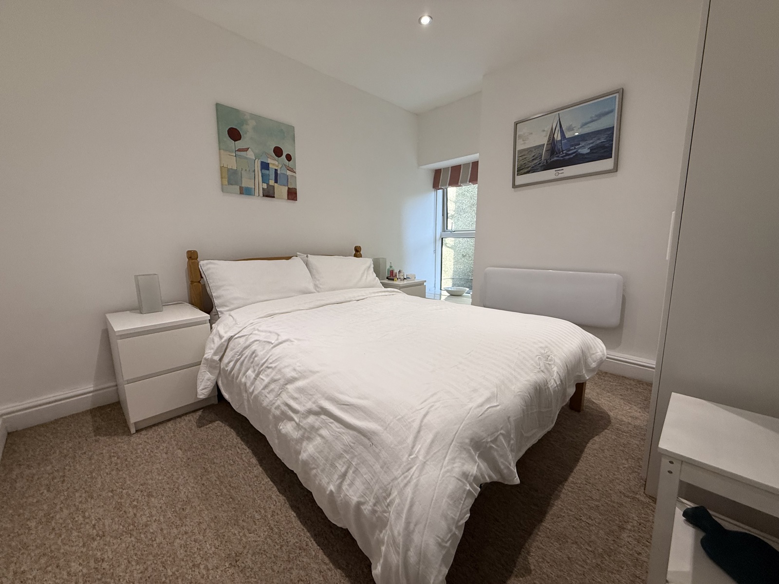 Carpet flooring, radiator, uPVC double glazed window to the side, down lighting.