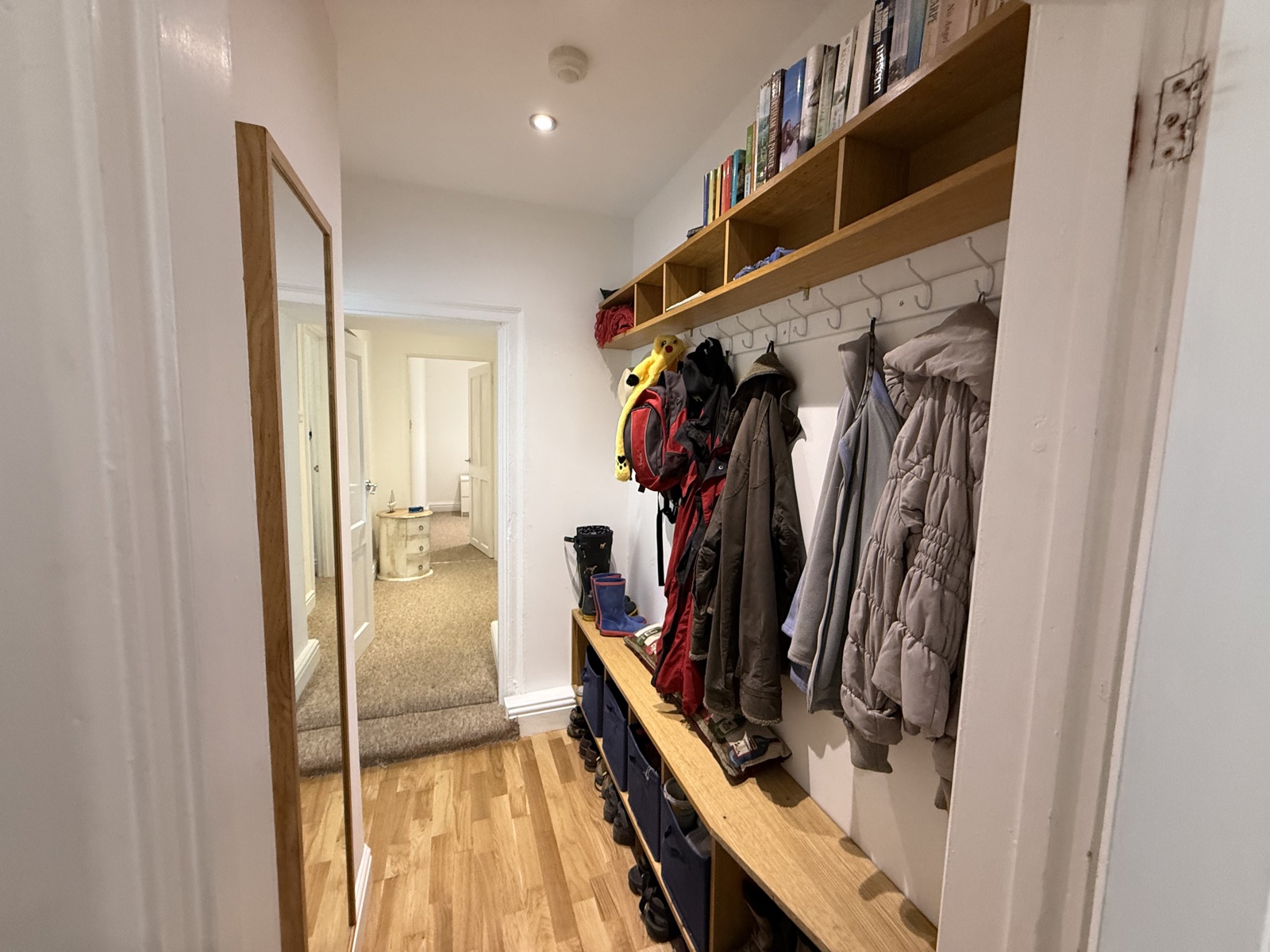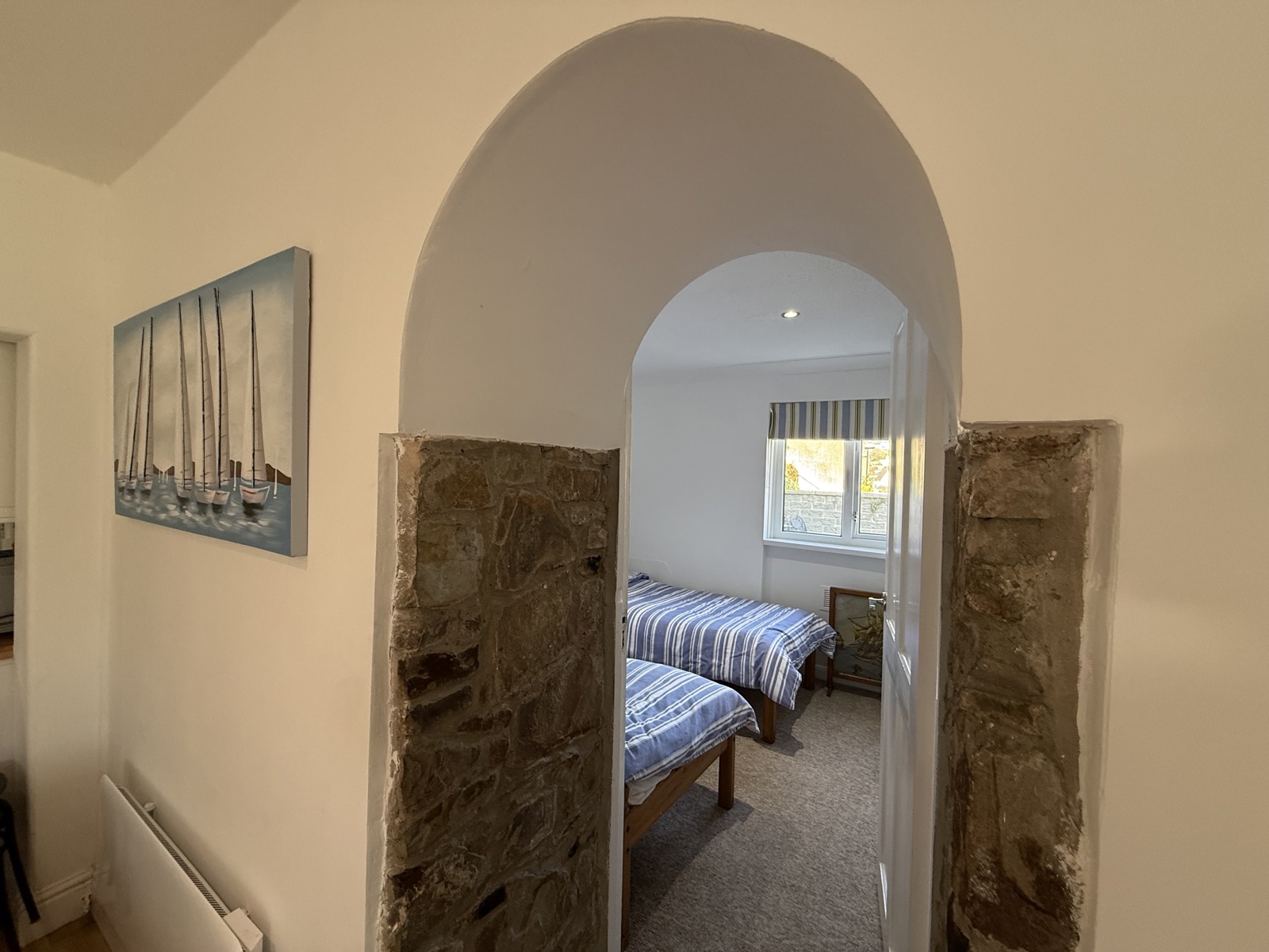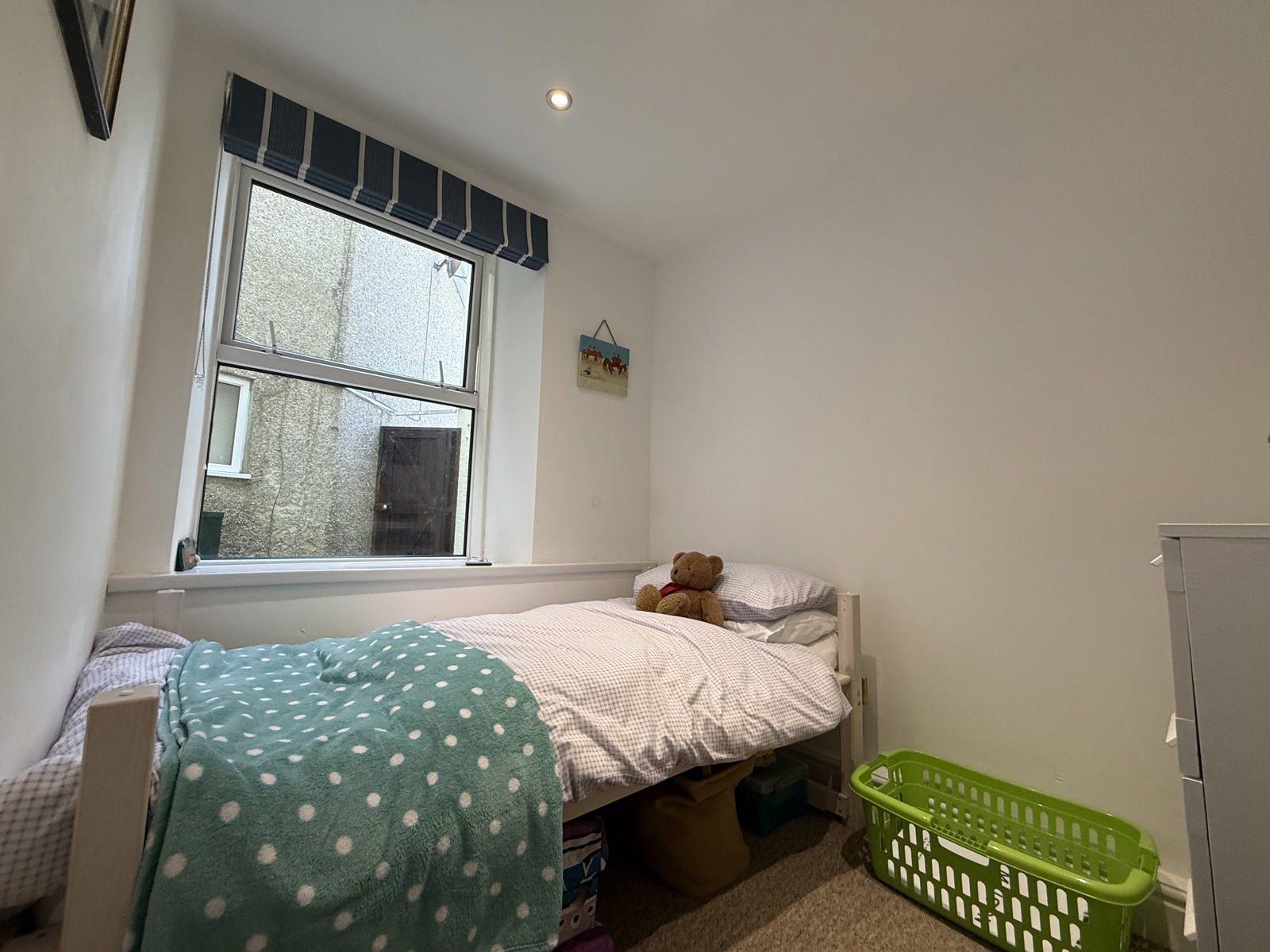 Carpet flooring, radiator, uPVC double glazed window to the side, down lighting.