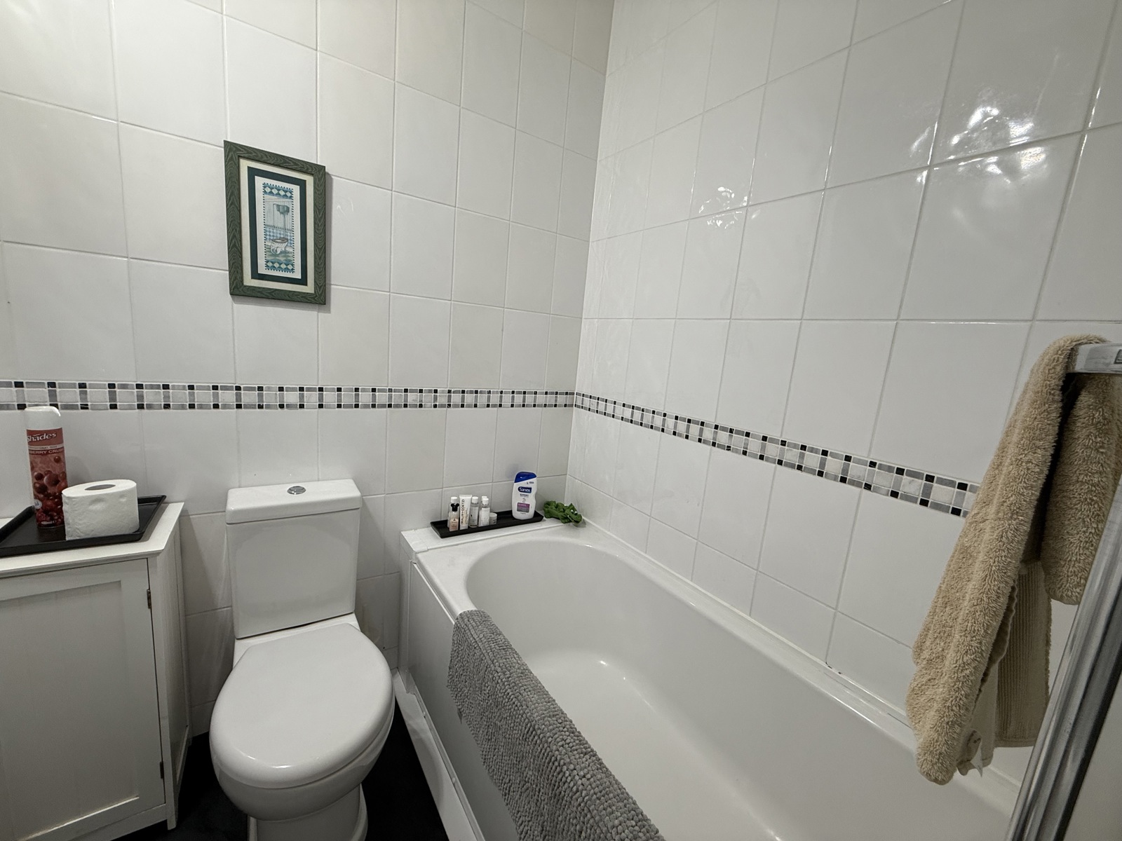 Vinyl flooring, floor to celing tile walls, low level W.C, bath with shower & screen, wash handbasin, light fitting.