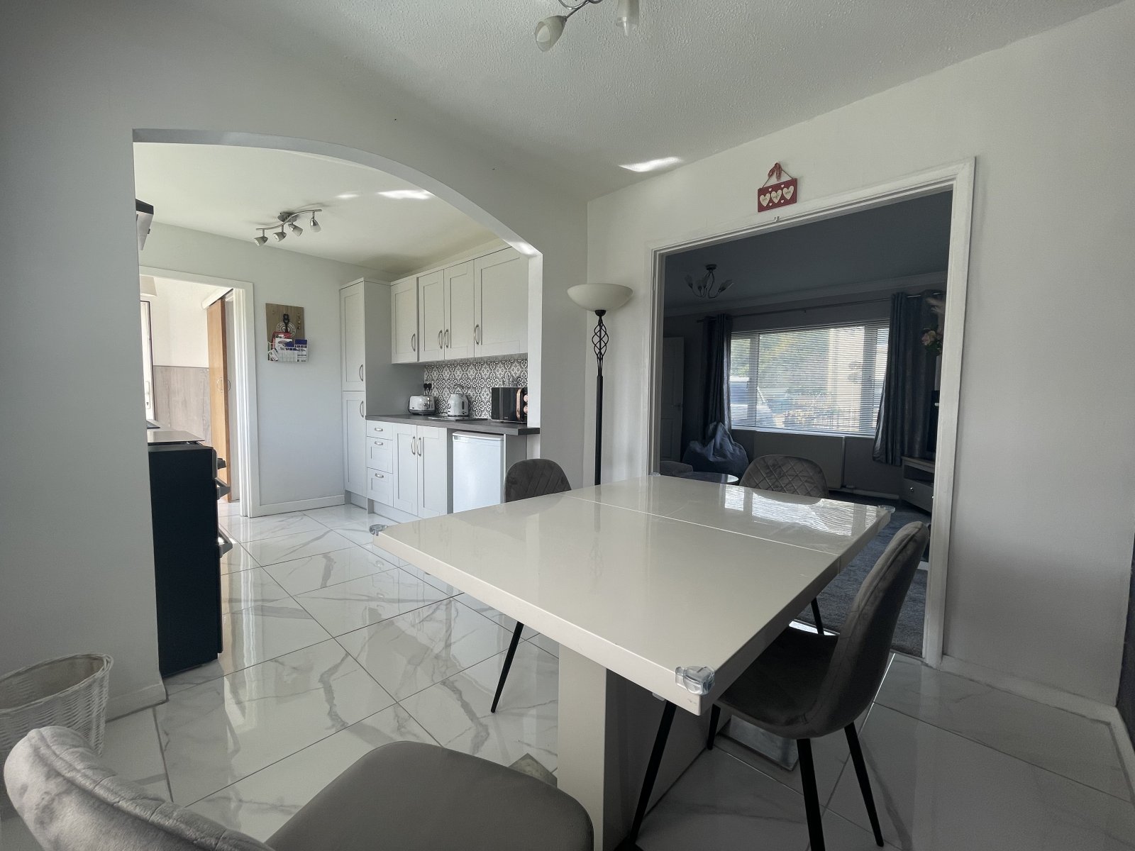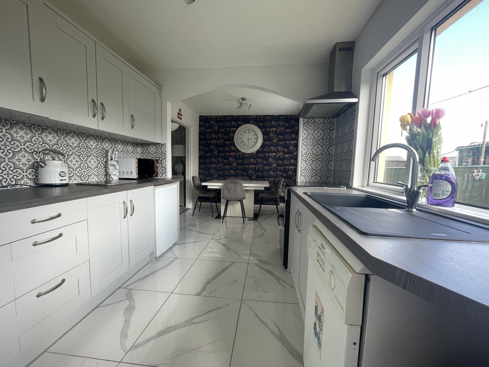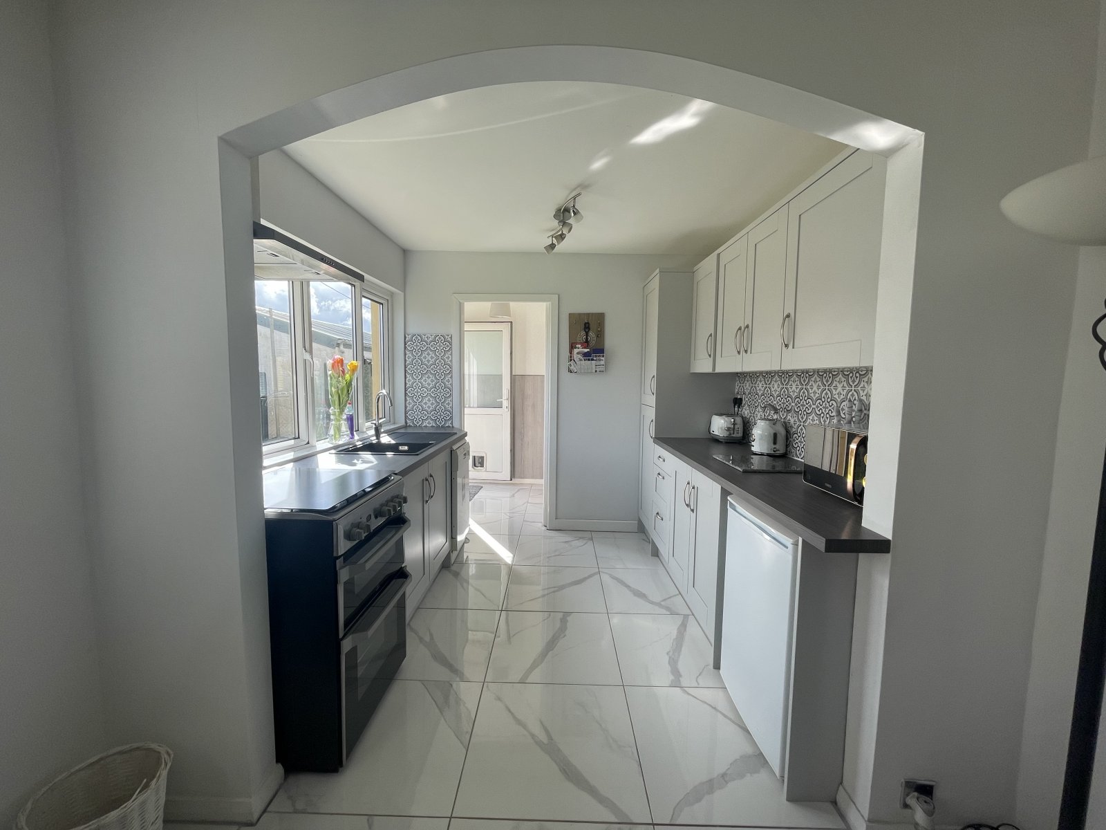 Tiled flooring, range of base and eye level units, sink, space for fridge, cooker and dishwasher, double glazed uPVC window to rear, tile splashback.