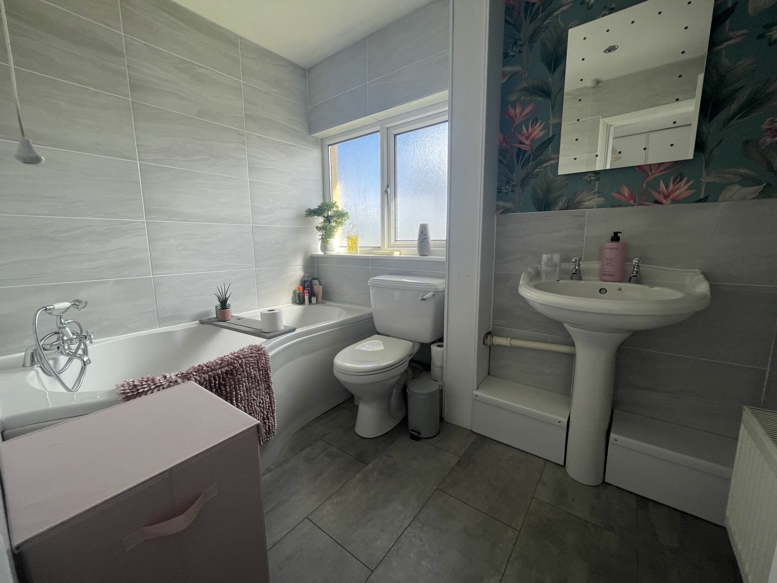 Tiled flooring, bath, WC, wash hand basin, fully tiled walls, double glazed obscure uPVC window to rear, radiator.