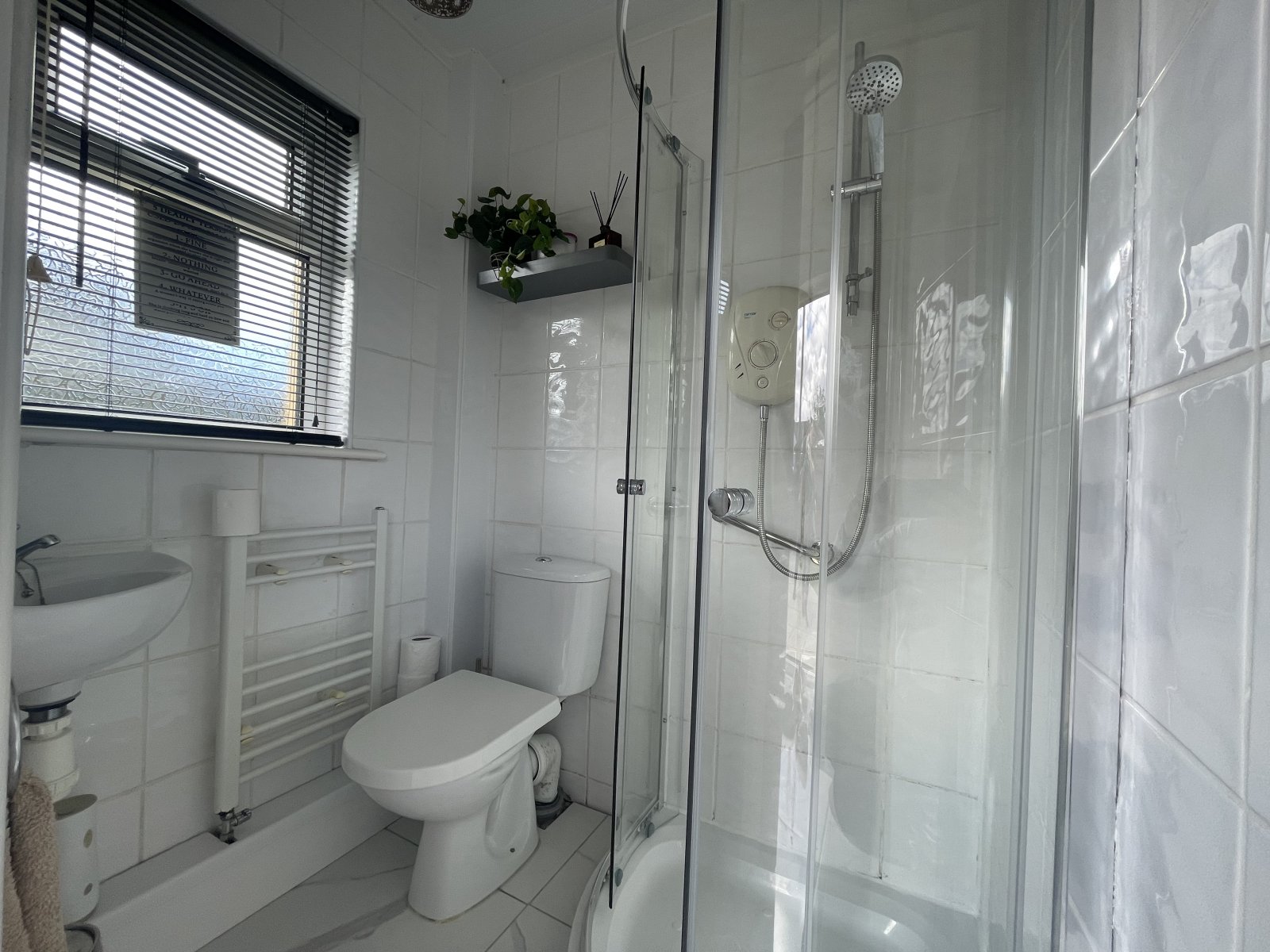 Tiled flooring, double glazed obscure uPVC window to the side, shower cubicle, WC, wash hand basin, heated towel rail, fully tiled walls.