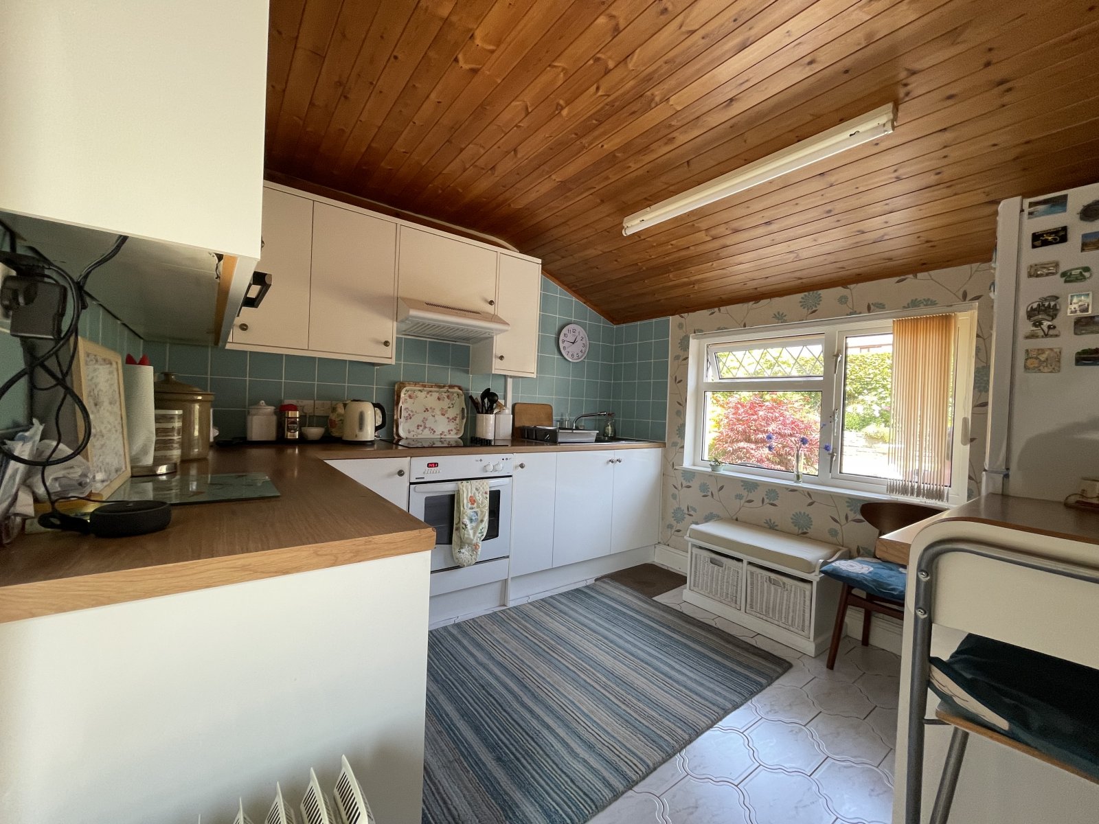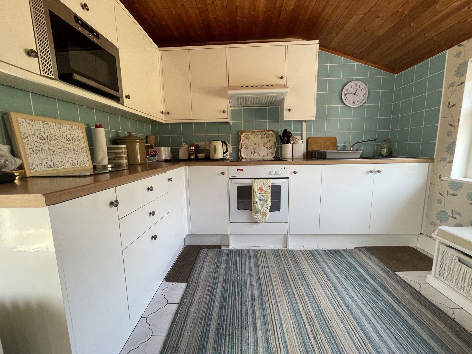 Tiled flooring, range of base and eye level units, electric hob & oven, microwave, fridge freezer, sink and drainer, tiled splashback, double glazed uPVC window to rear and door to side, radiator.
