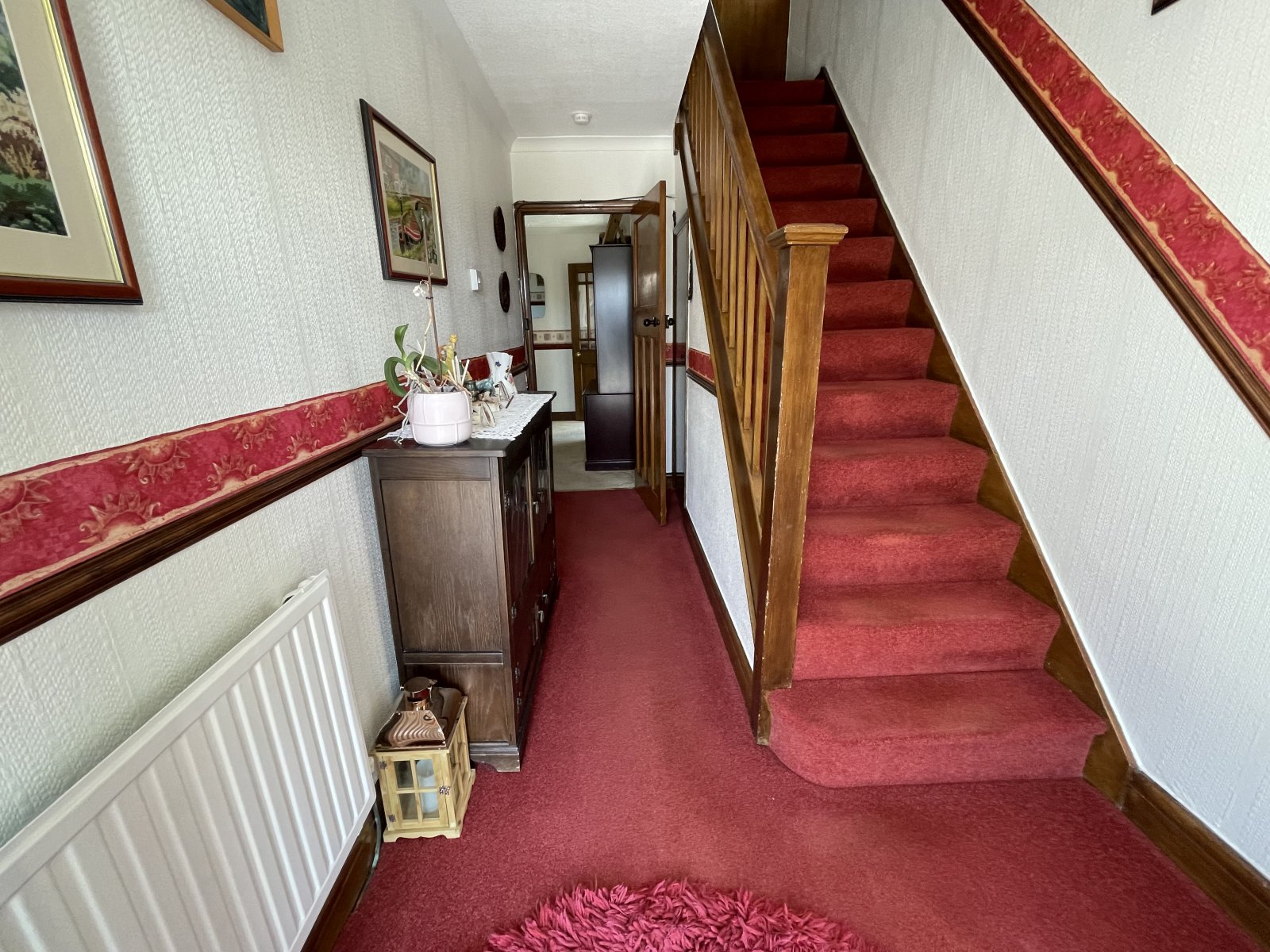 Carpet flooring, under stairs storage, stairs to first floor, double glazed uPVC window to side and door to fore, radiator.