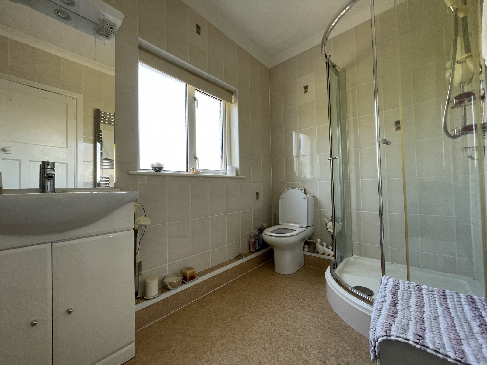 Vinyl flooring, WC, wash hand basin, shower, heated towel rail, obscure glass double glazed uPVC window to rear.
