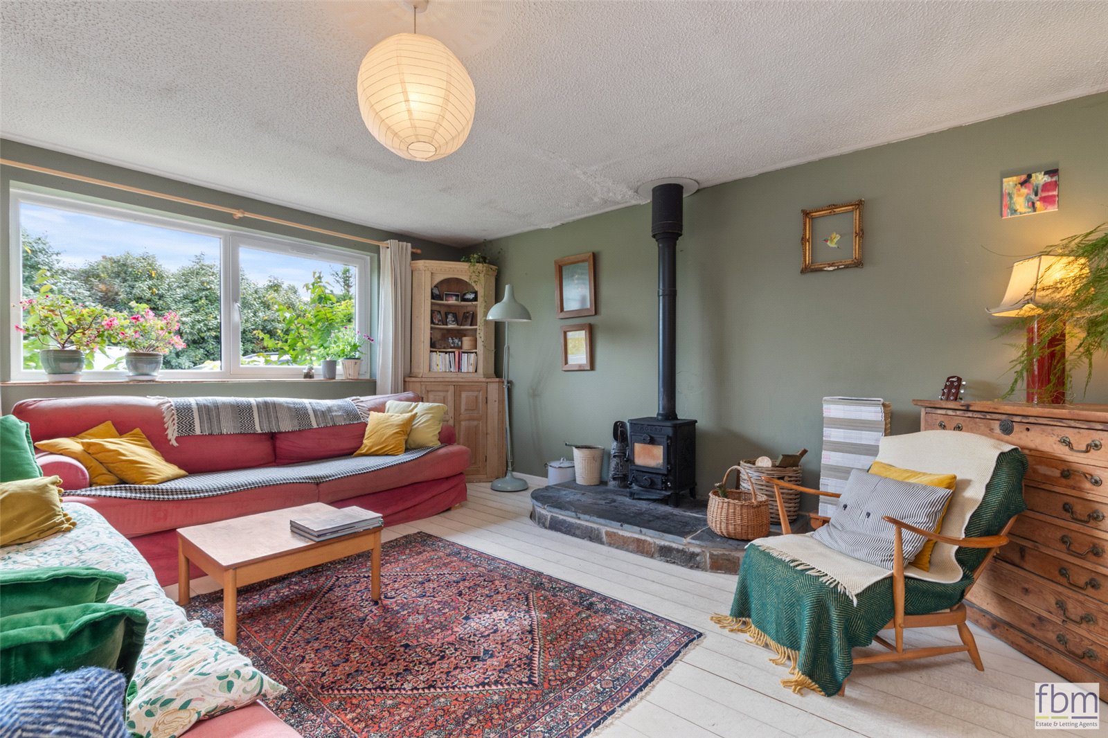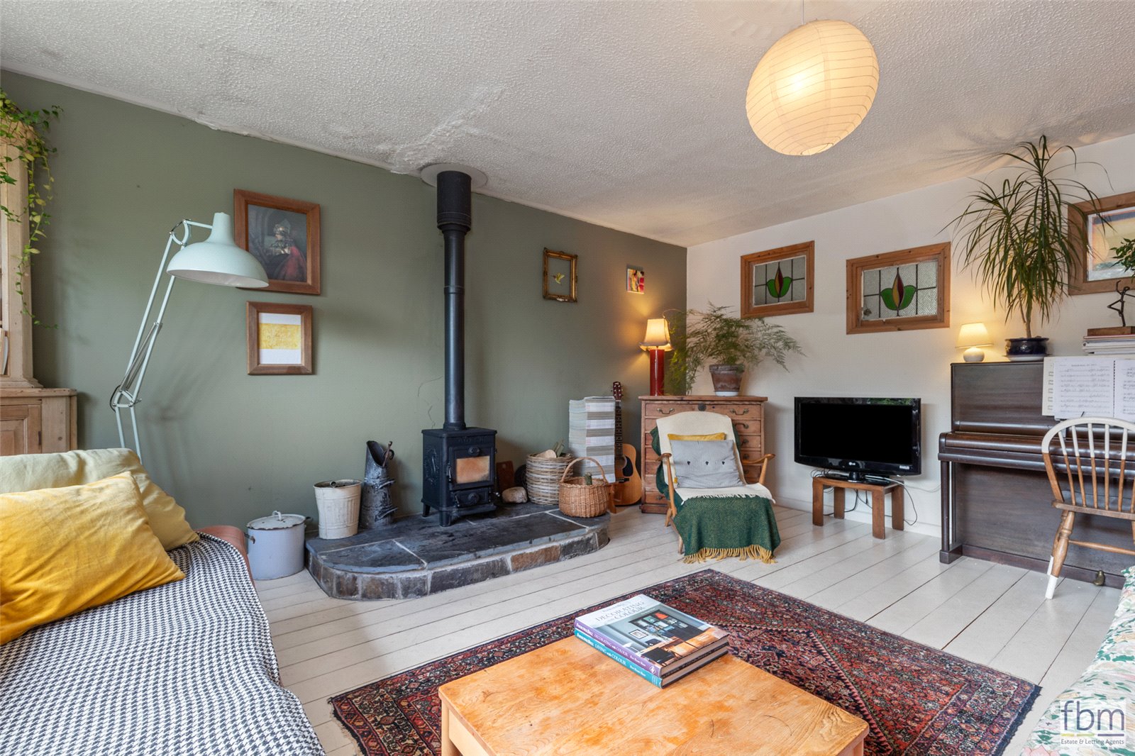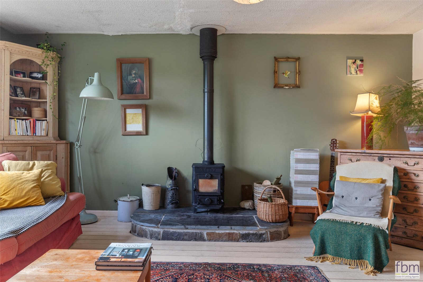Bright and spacious lounge, with front aspect view through uPVC double-glazed window units. Also comprising of natural wooden flooring, fitted wood burner upon stone hearth, stain glass windows to interior wall, light fitting and heater.