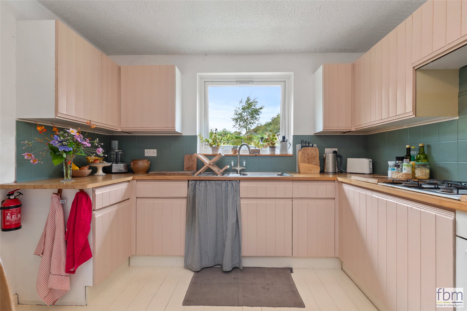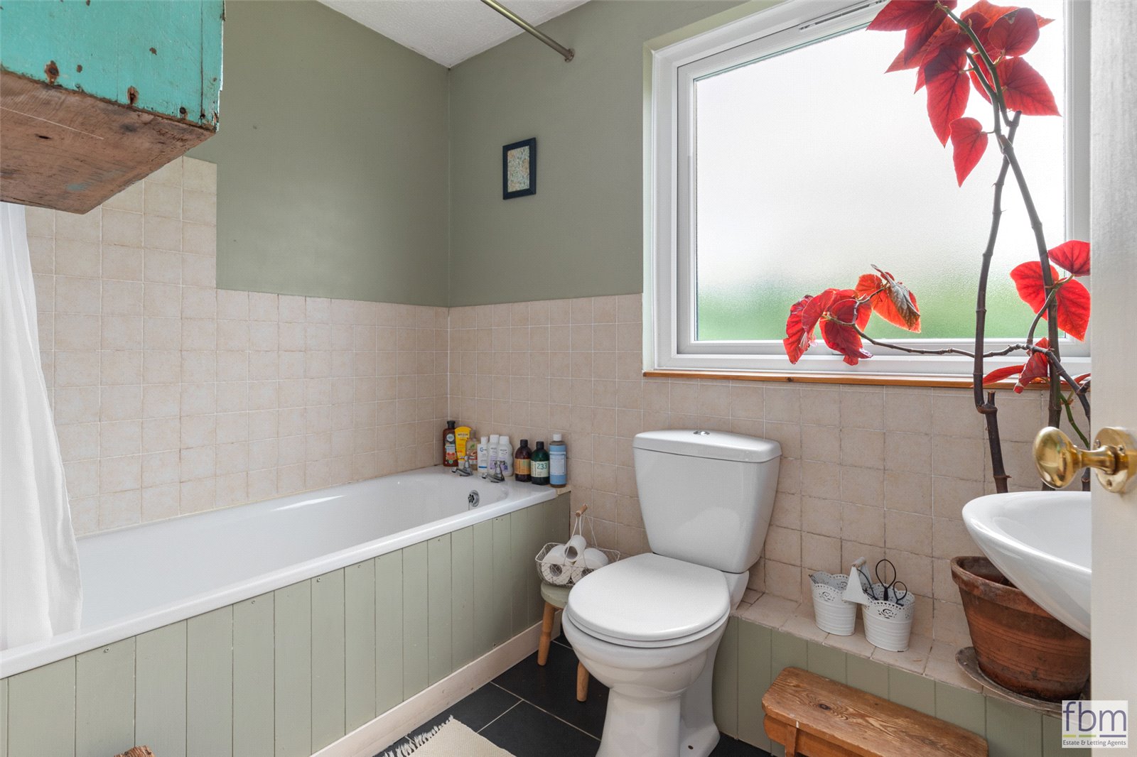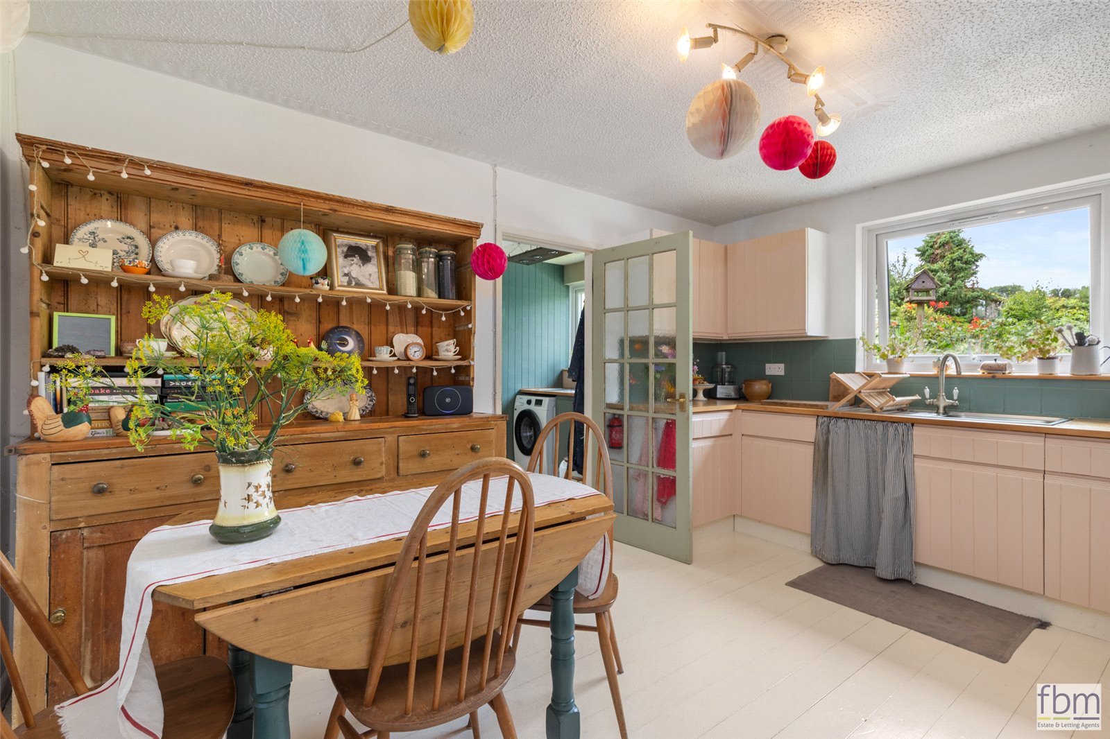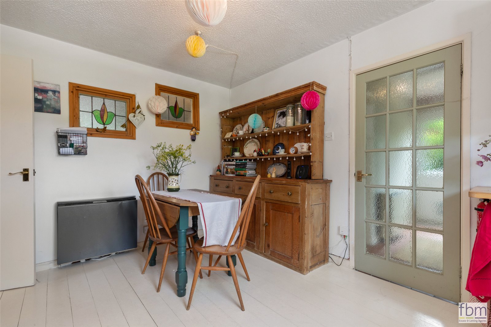Rustic utility style kitchen/diner, with an array of base and wall units with integrated electric oven, gas hob, sink with mixer tap. There is a uPVC double-glazed window giving pleasant views over the rear garden, as well as ample space for dining table, wooden flooring, spotlight fittings, heater and access to;