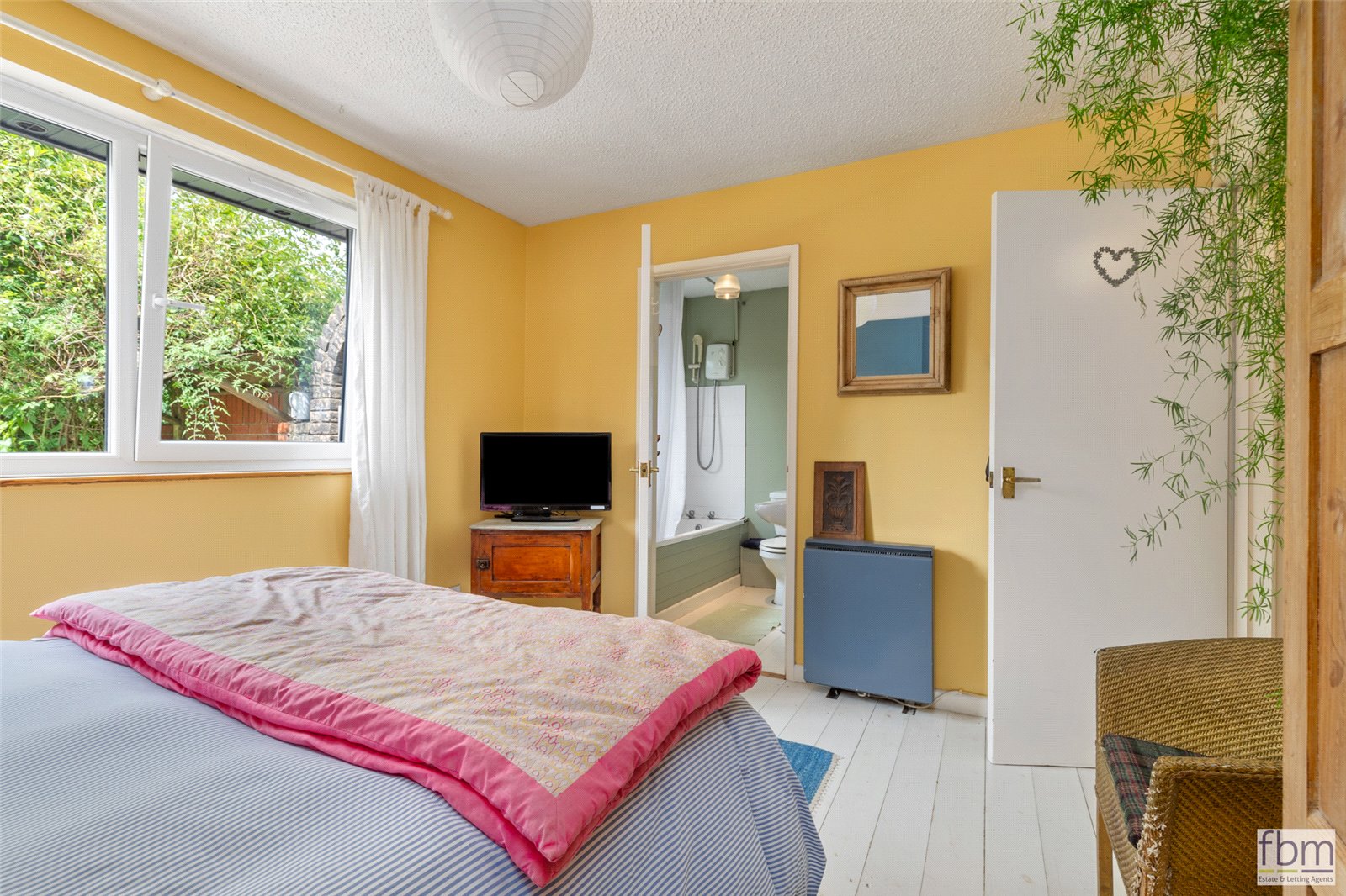 Master bedroom suite, with rear-facing aspect views over the garden and paddocks beyond. Benefitting from wooden flooring, light fitting, heater and uPVC double-glazed window. Access to;