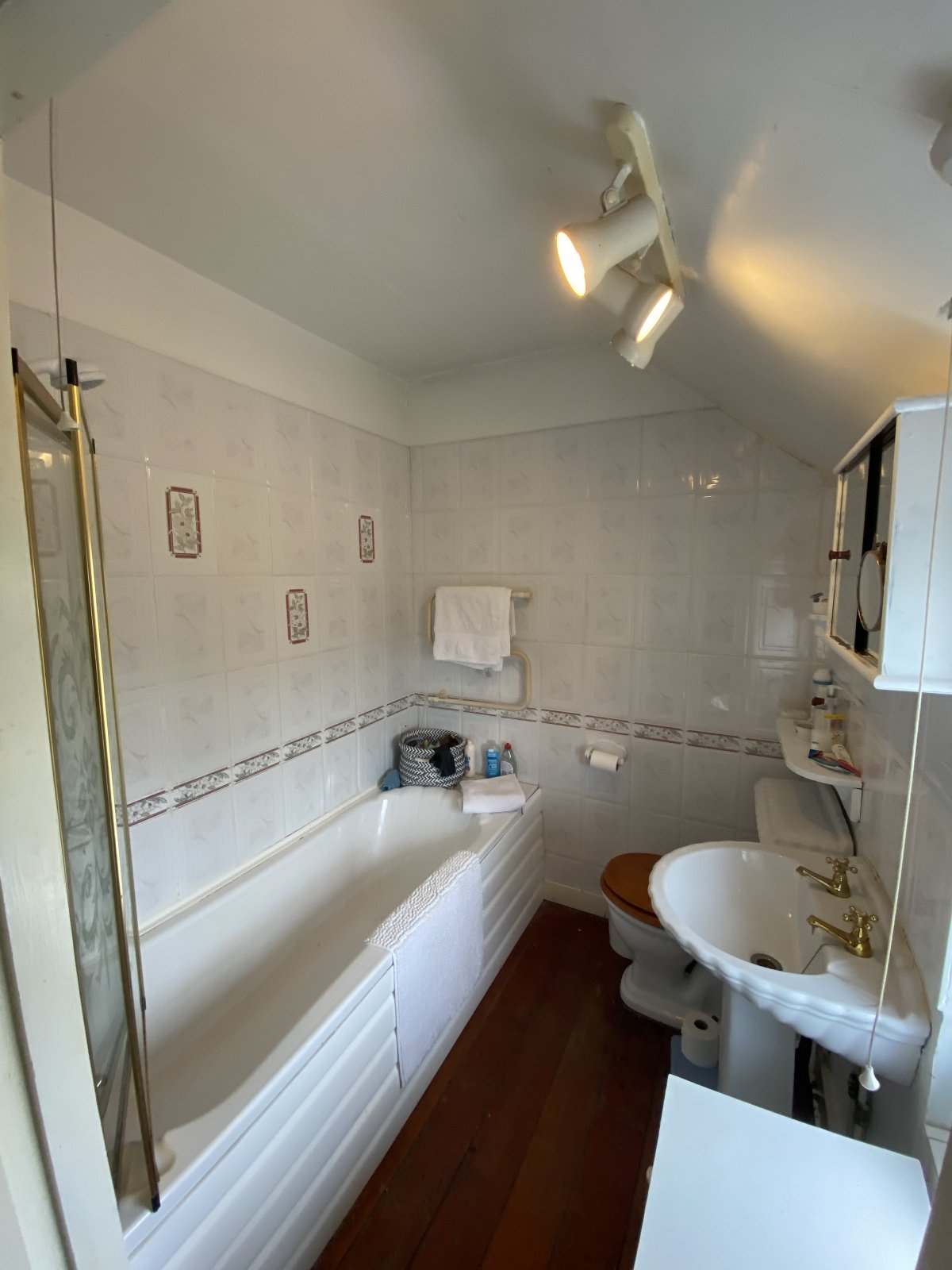 White bathroom suite with power shower over bath, tiled walls, rear facing window, ceiling spot lights, heated towel rail.