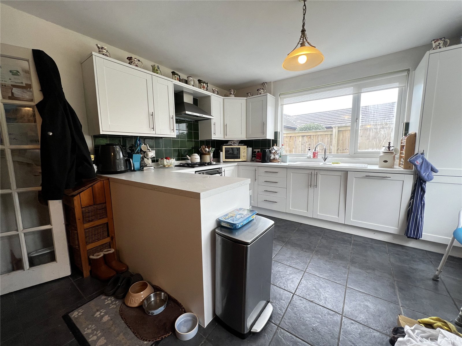 Hallway connecting the living room to the kitchen and utility room, featuring tiled flooring and a storage cupboard under the living room staircase.