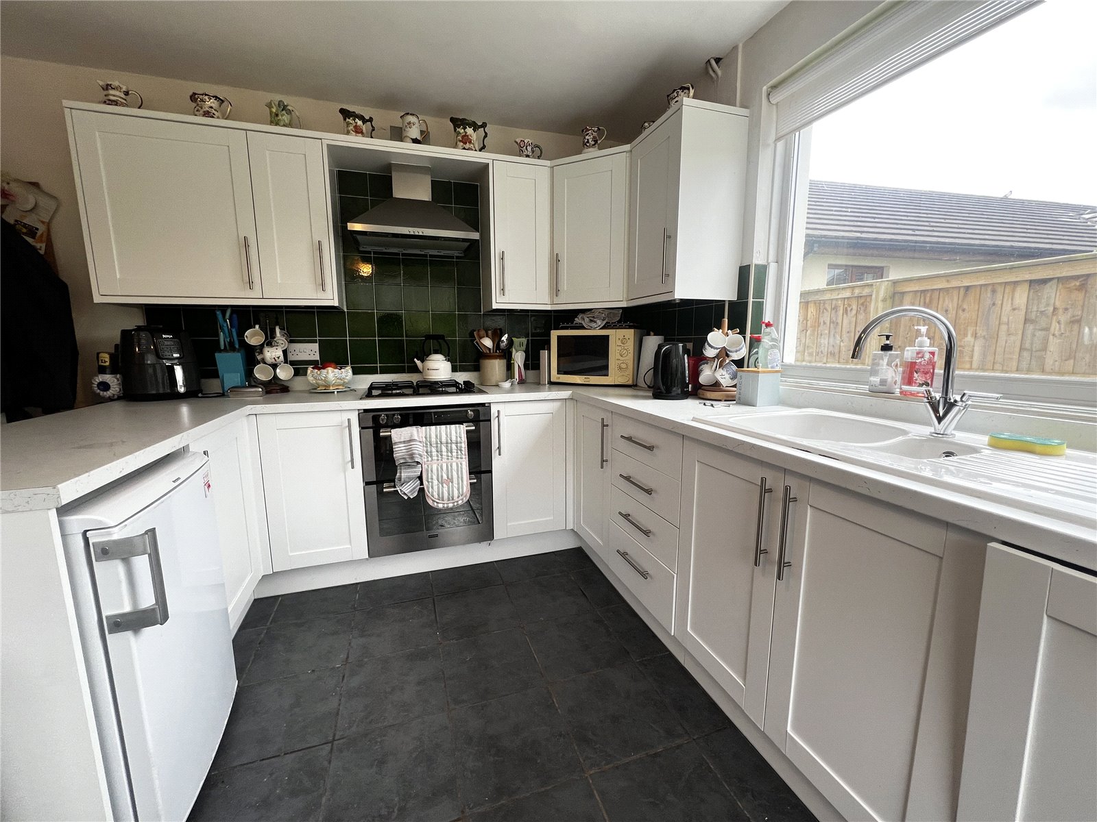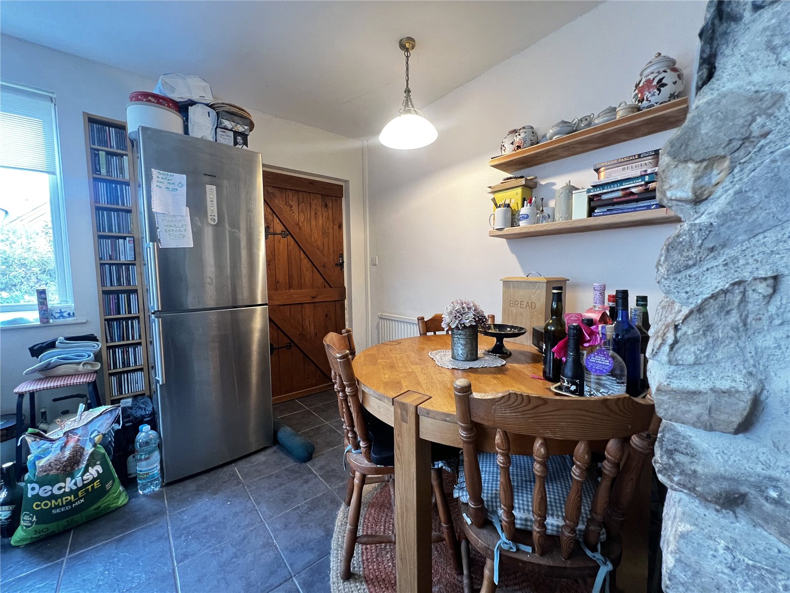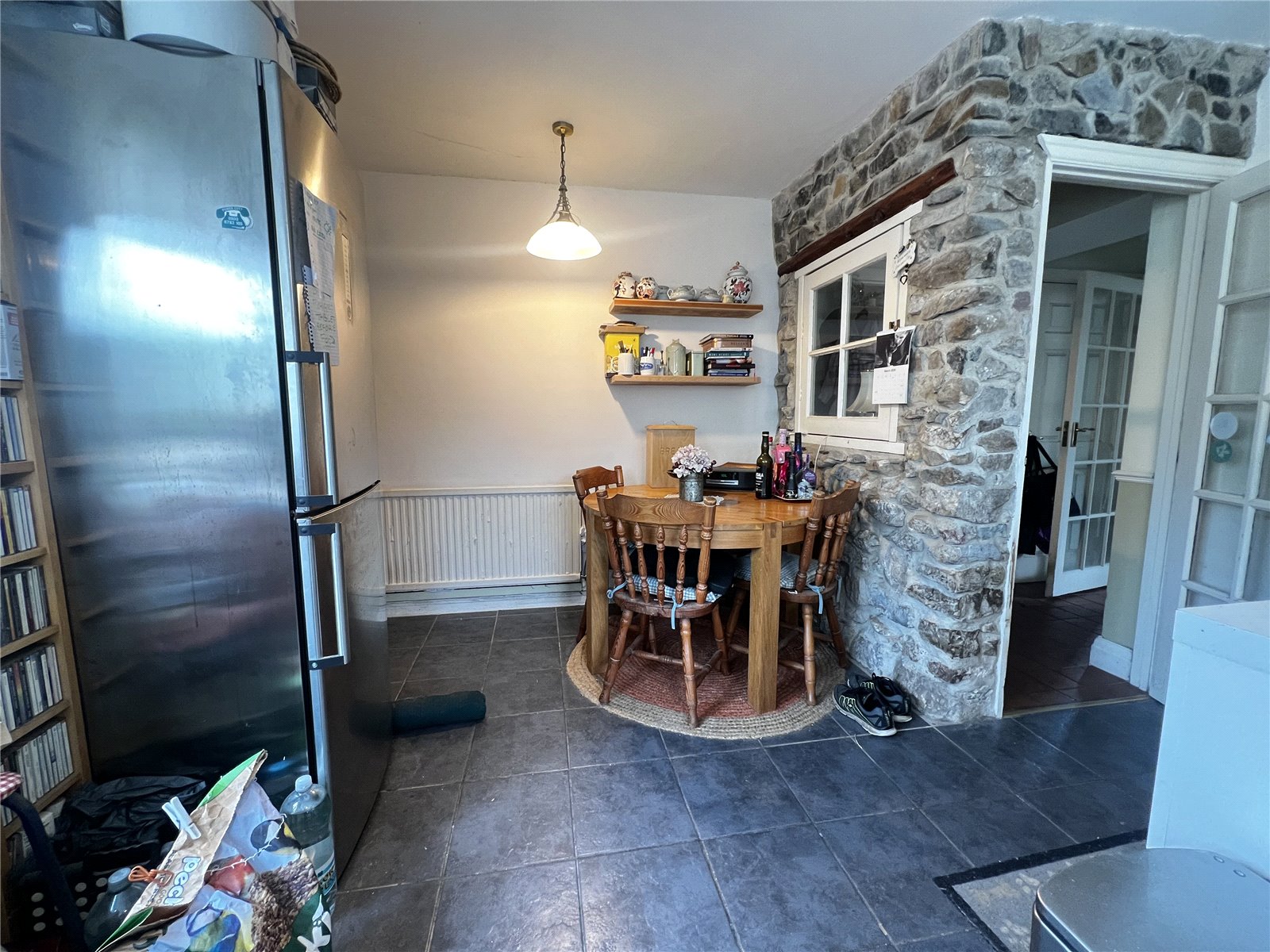 Kitchen/dining area with tiled flooring and a stone feature wall with an internal window looking into the hall. Fitted with wall and base mounted units with integrated appliances and space for fridge freezer. Also includes a tile splashback, two double glazed windows, two radiators, and a door leading to the back porch accessing the garden.