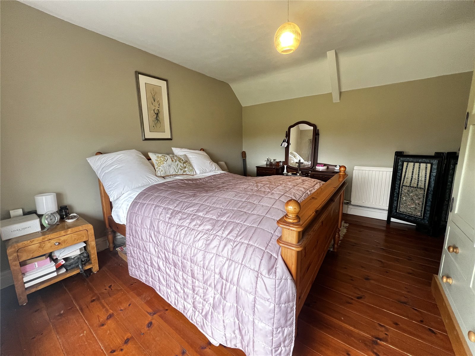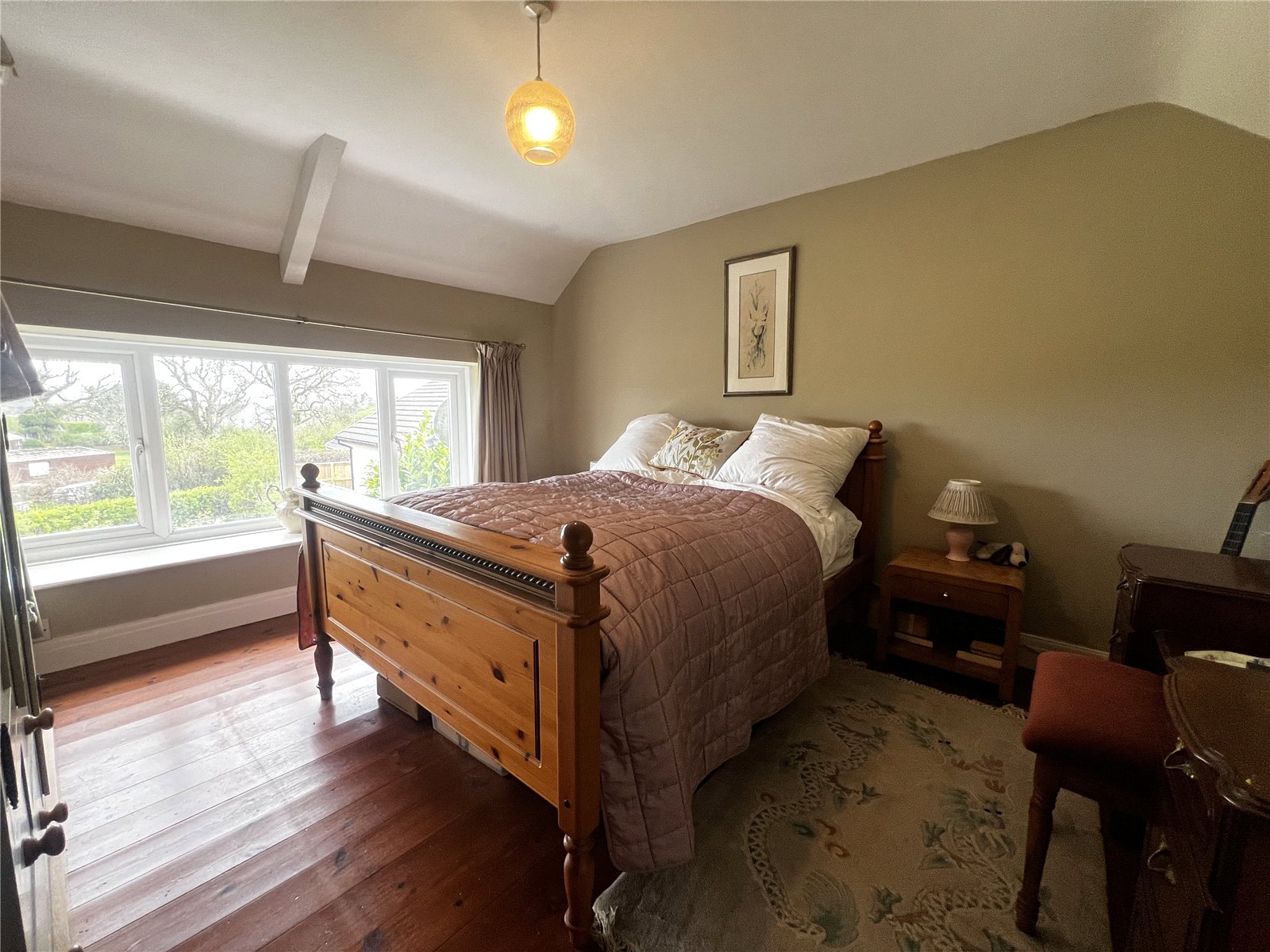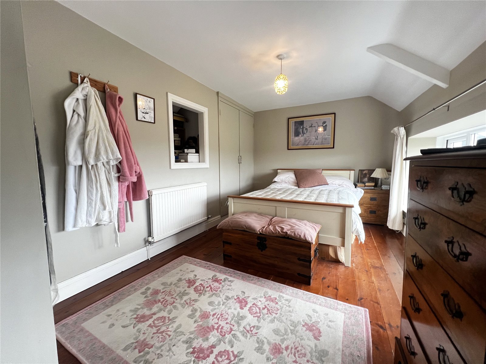 Spacious master bedroom featuring wooden flooring, three double-glazed windows, built-in wardrobe and storage, plus a radiator for comfort.
