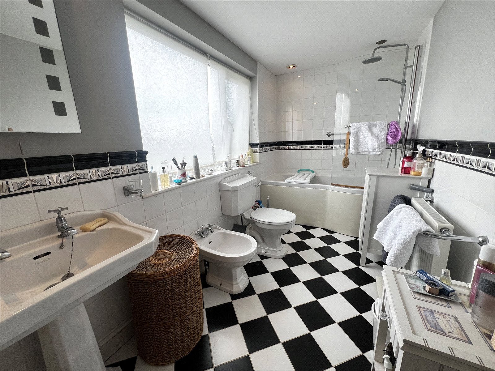 Family bathroom featuring tiled flooring with underfloor heating, a bathtub with overhead shower, WC, bidet, and a wall and base-mounted wash-hand basin with a tiled backsplash. Also includes a double-glazed window and a radiator.