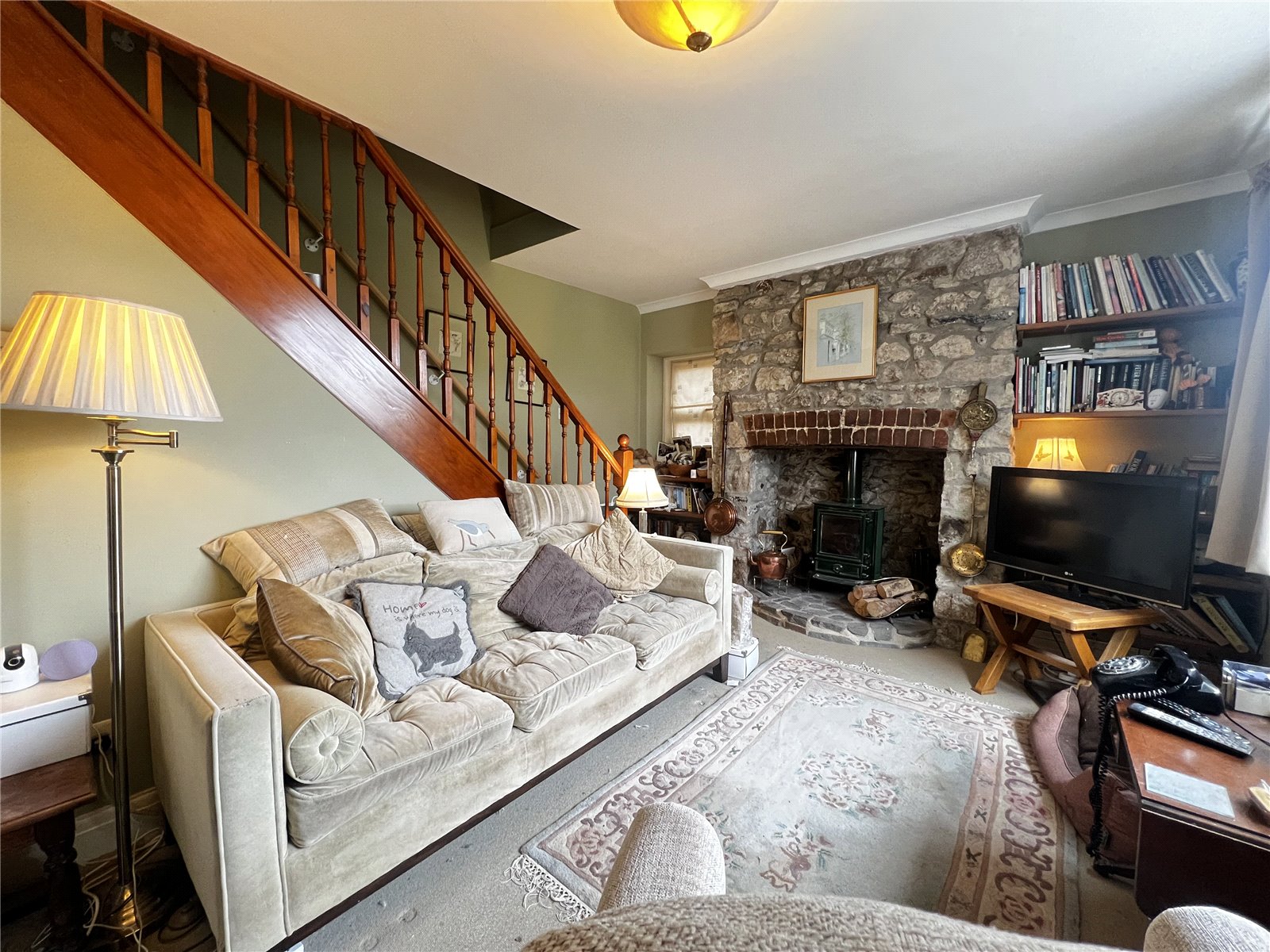 A carpeted living room featuring a stone wall with a fireplace. Includes two double-glazed windows, one single-glazed window and two double radiators. The room offers access to a hall that leads to the kitchen and utility area, and a staircase rising to the upper floor.