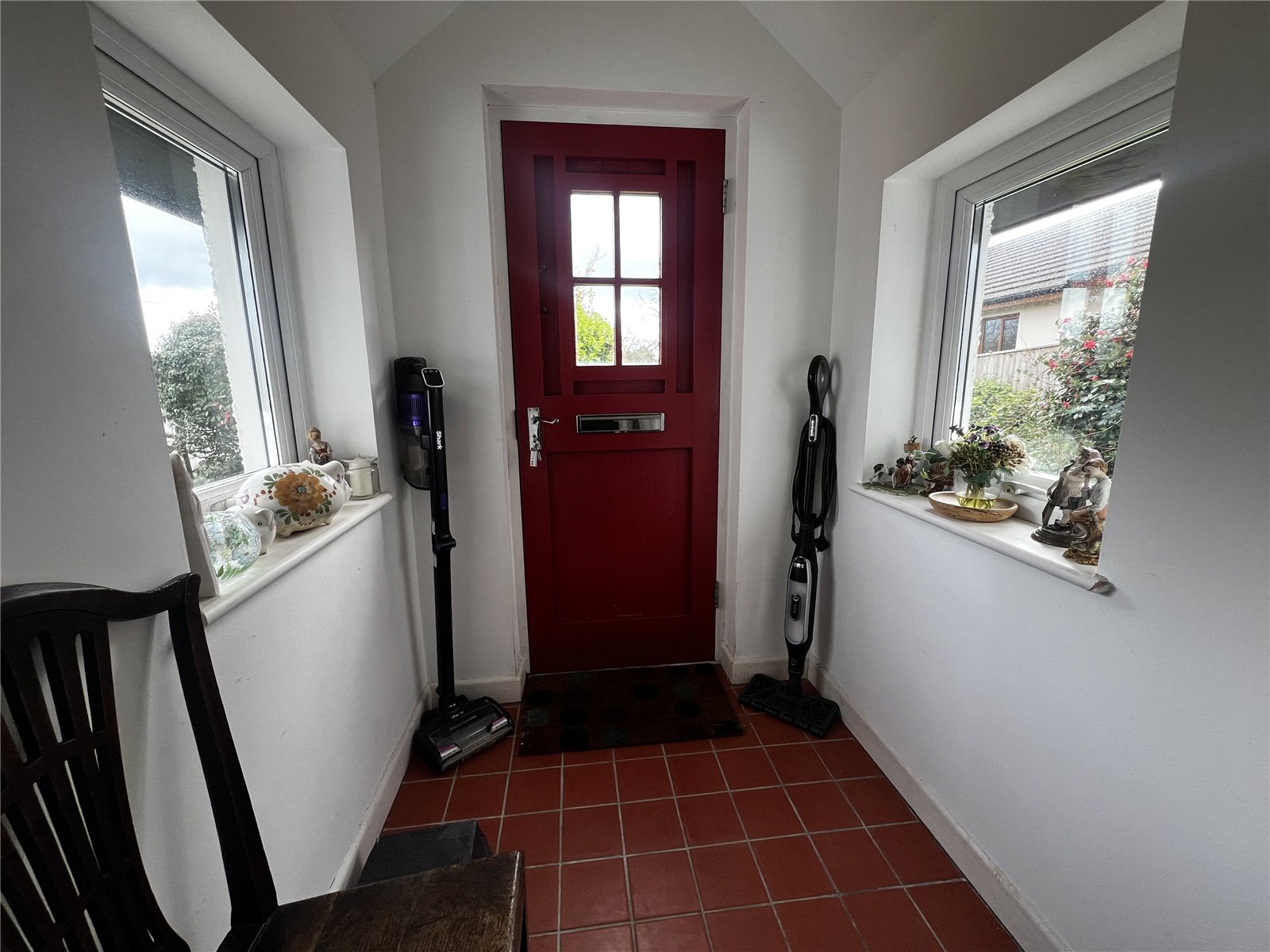 Entrance porch with tiled flooring and two double glazed windows, leading to the living room.