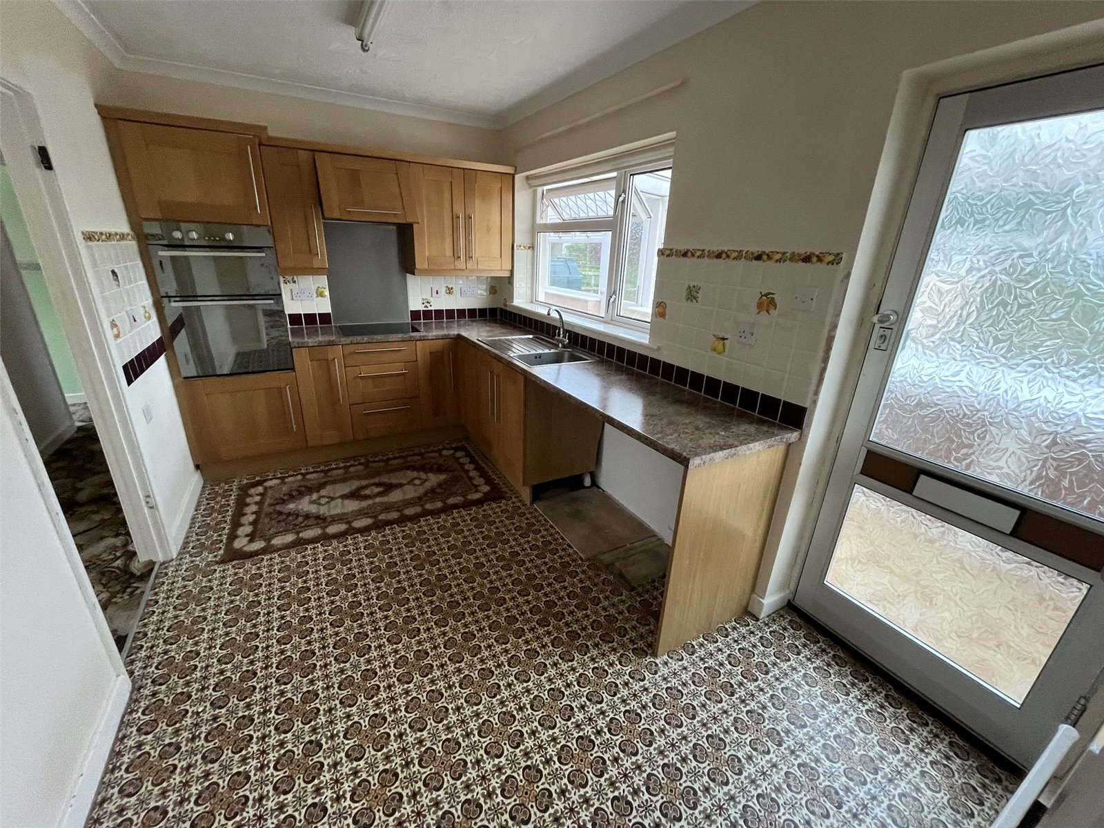 Sizeable kitchen space, comprising of a range of fitted base & wall units, with integrated electric fan oven, four ring induction hob with extractor and lighting over, stainless steel sink and drainer. Also benefitting from plumbing for washing machine, vinyl flooring, uPVC double-glazed rear aspect window, radiator, light fittings and access to;
