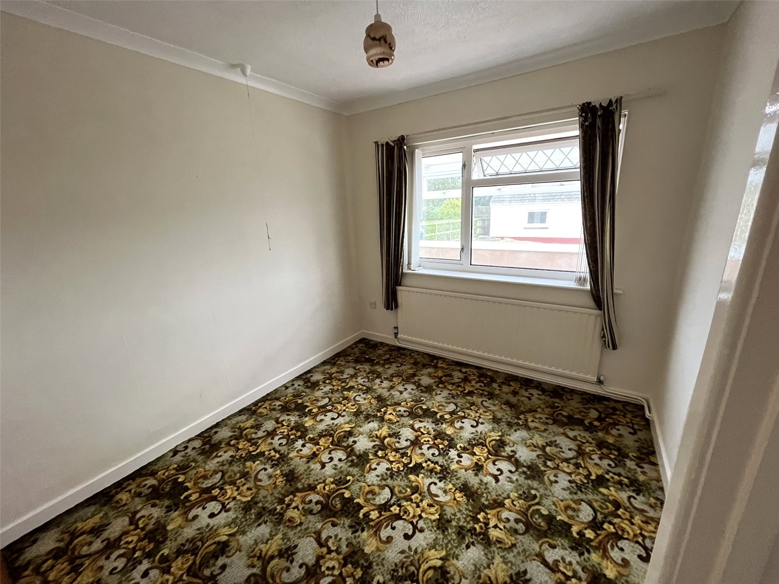 Rear-facing double bedroom, with uPVC double-glazed window, radiator, carpeted flooring and light fitting.