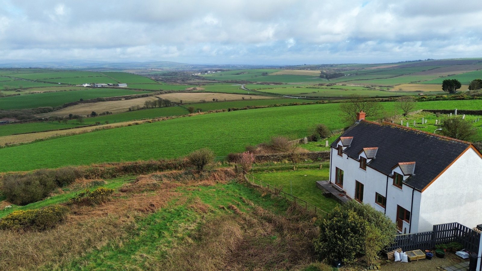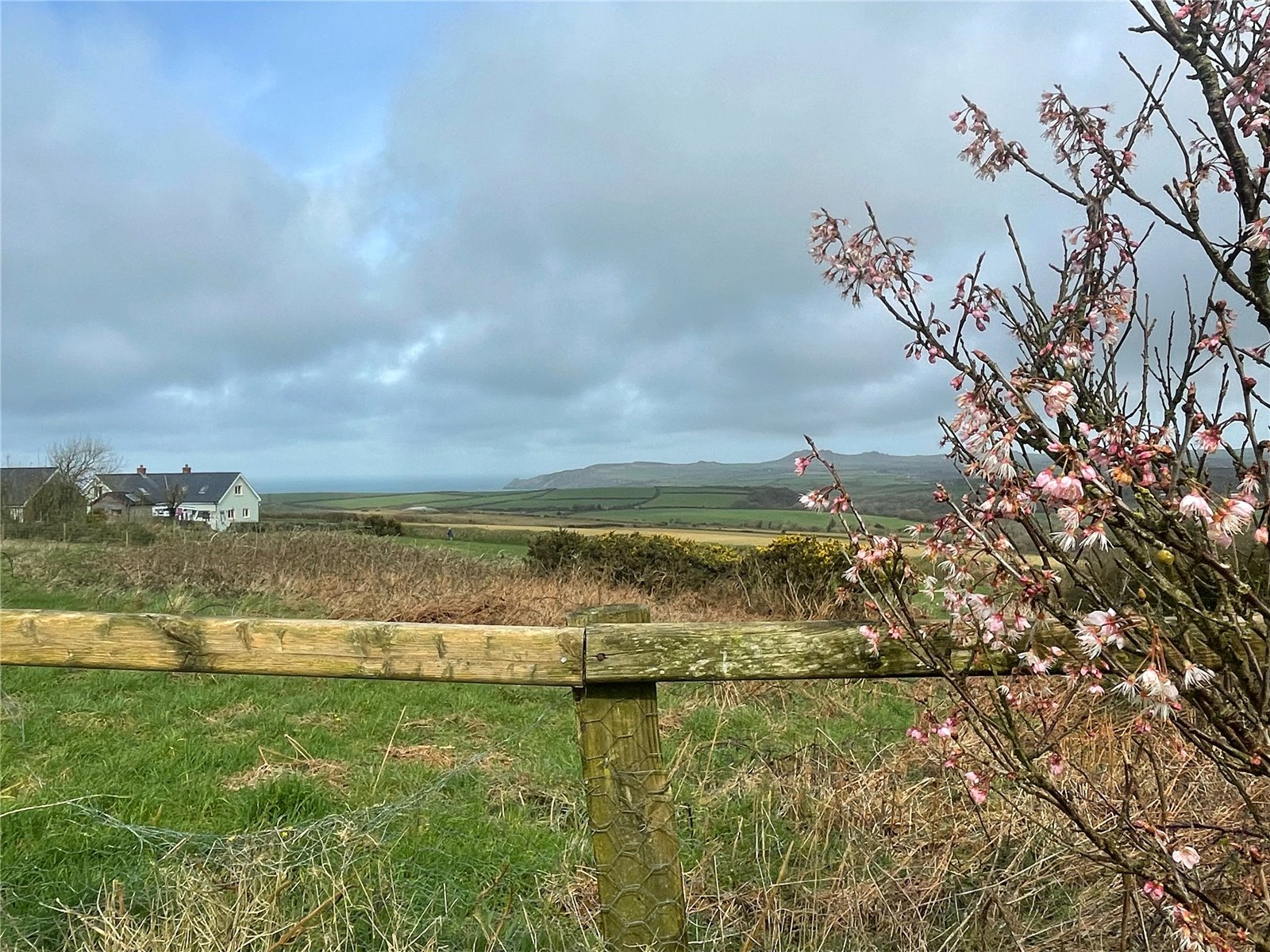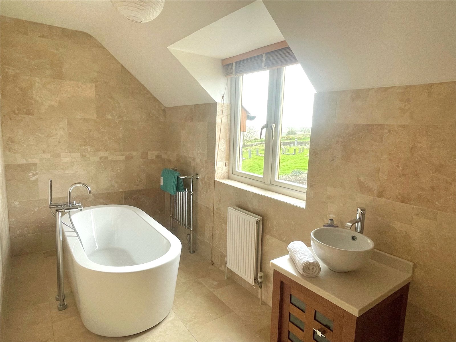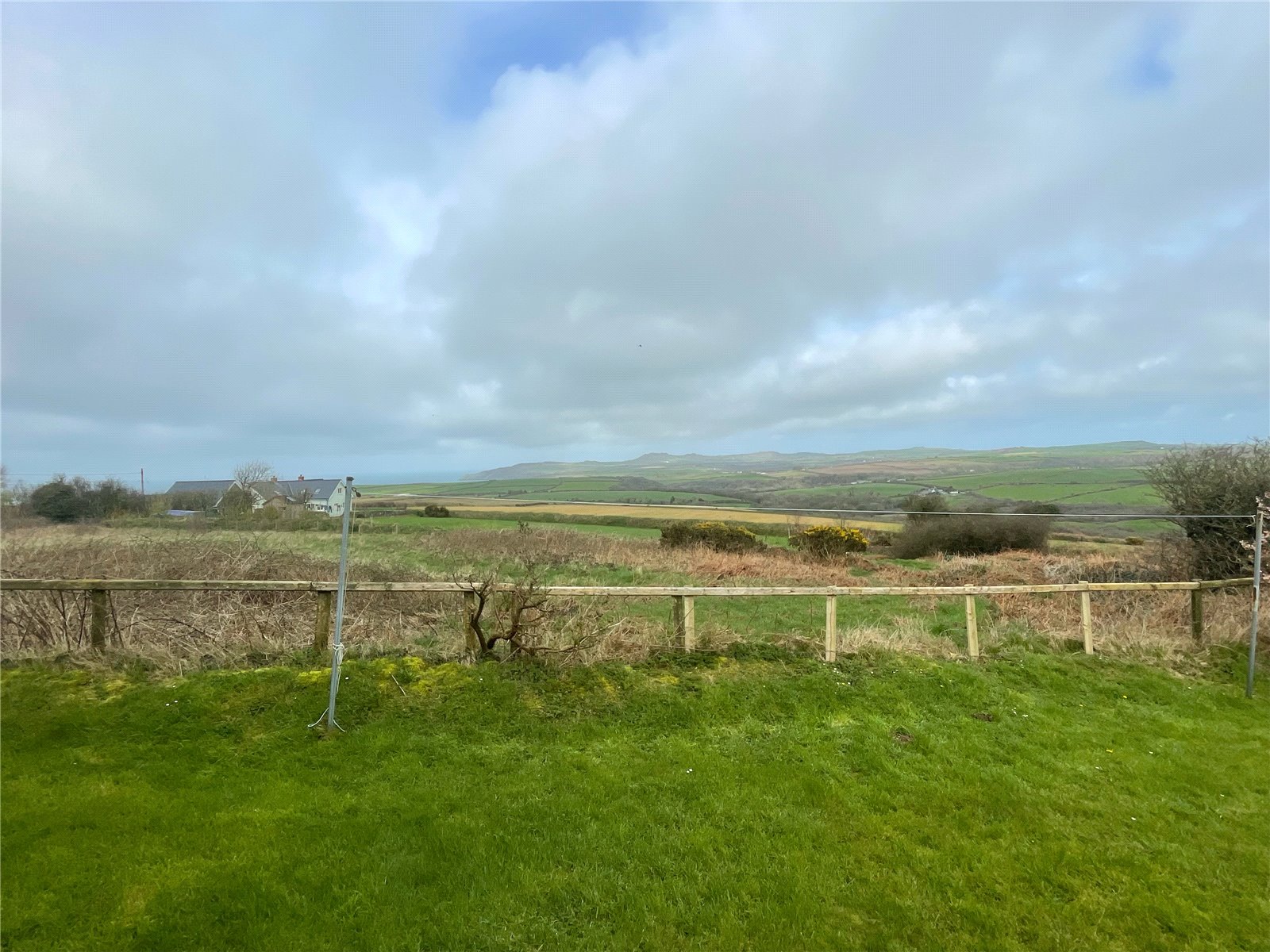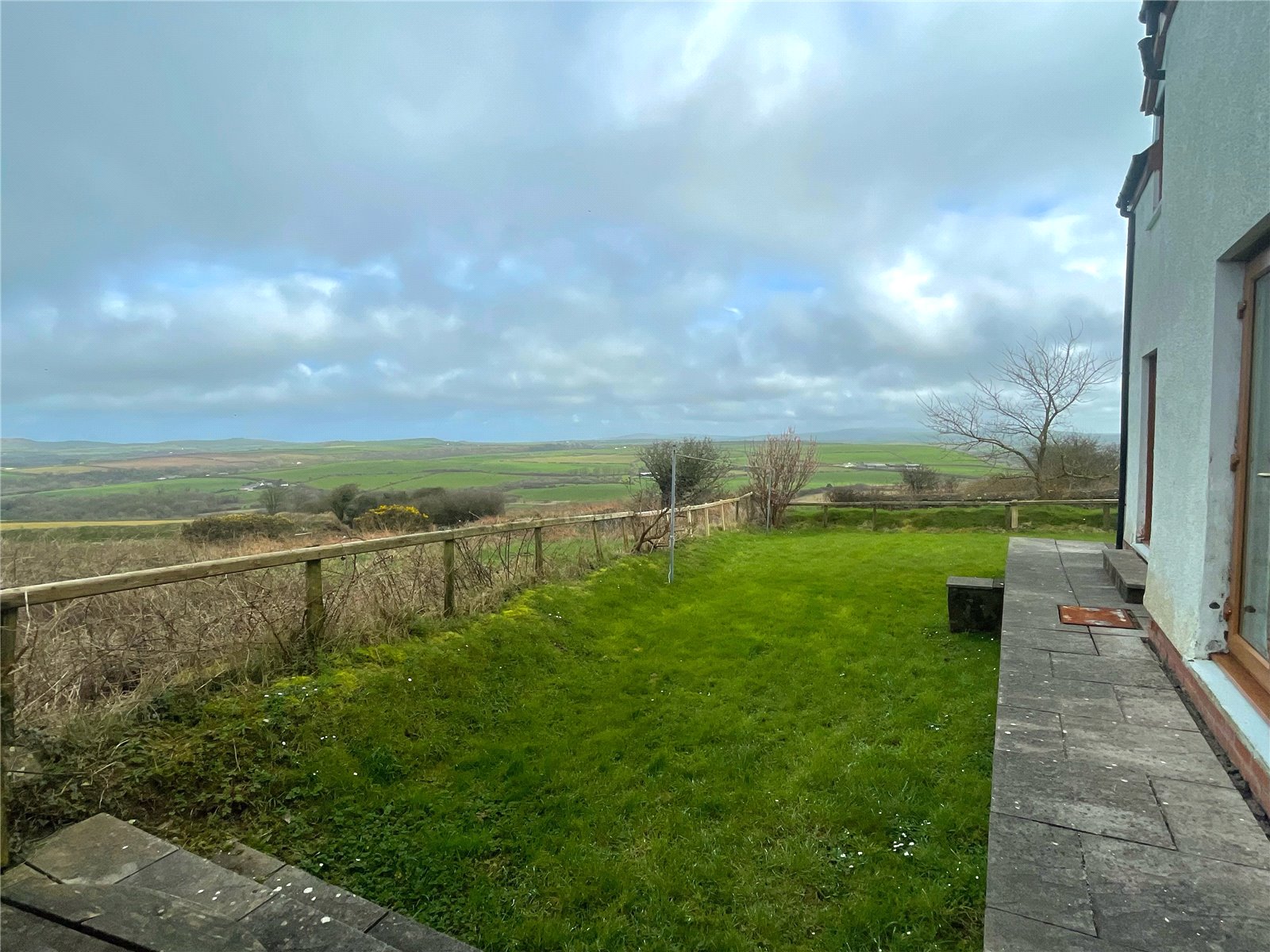 To the rear is a patio area, perfect for a table and chairs. The patio continues around the entire back of the property, leading back to the front. Down some steps there is a garden area laid to lawn. There are spectacular views of the countryside and coast from the rear and side of the property.