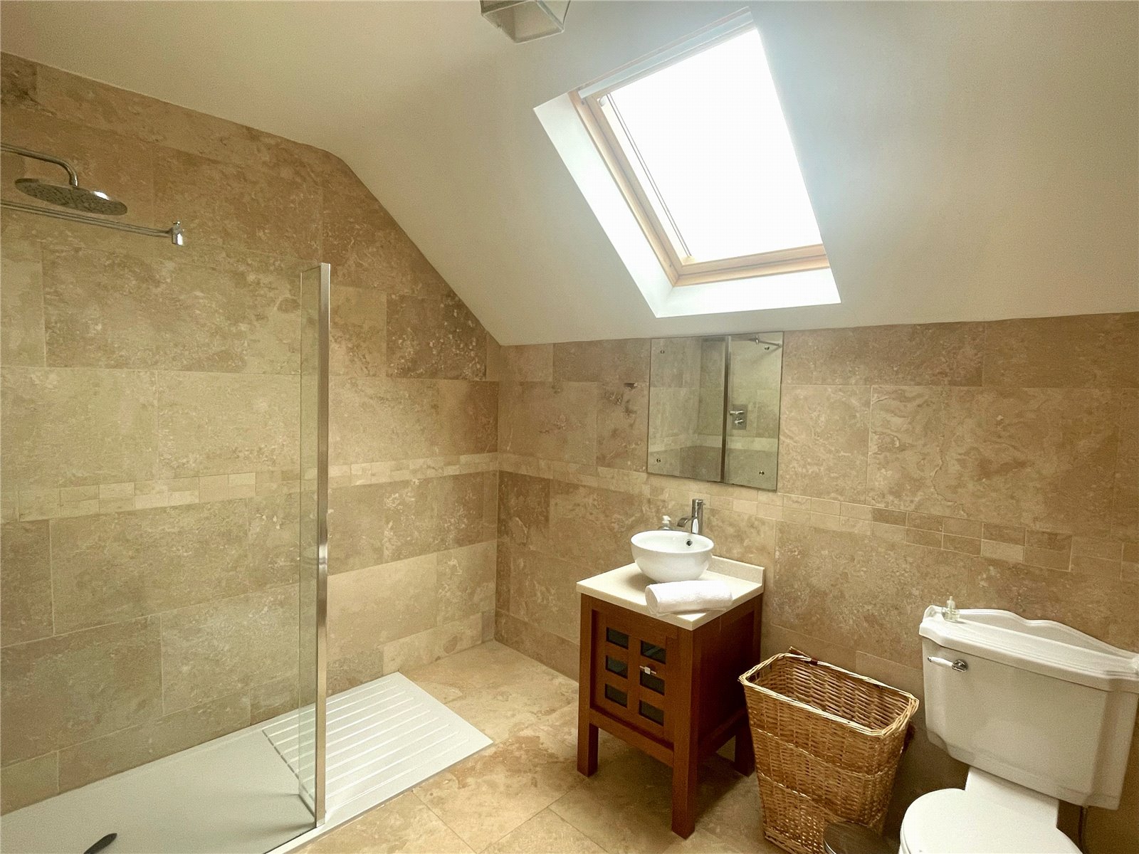 Stone tiled walls and floor, WC, wash hand basin with mixer tap on vanity unit, double sized shower with glass screen, heated towel rail.