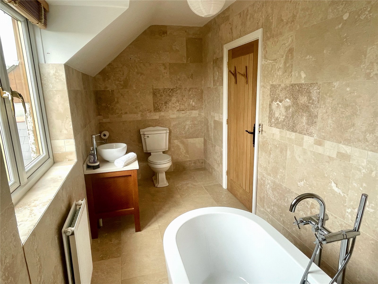 Stone tiles walls and floor, wash hand basin on vanity unit with mixer taps, heated towel rail, stand-alone bath with mixer taps.